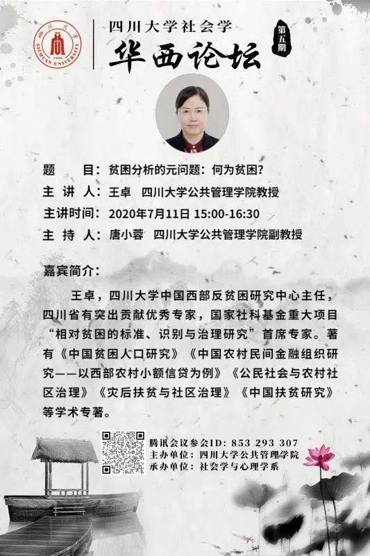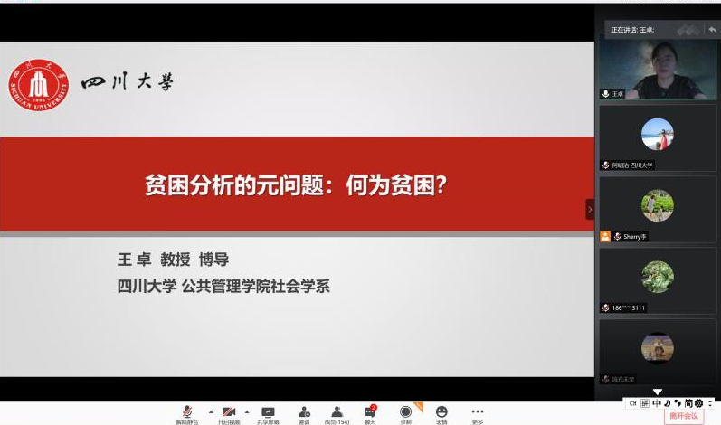 2020年7月11日下午15:00,PA视讯游戏官网社会学华西论坛云系列讲座第五期成功举办。PA视讯游戏官网王卓教授主讲“贫困分析的元问题:何为贫困?”,讲座层层深入、引人入胜。讲座由唐小蓉副教授主持,来自PA视讯游戏官网的师生、四川省社会学界的同仁,及兄弟院校近200人参与讲座。