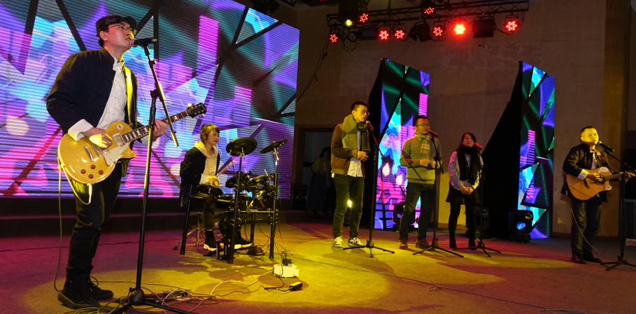 PA视讯教职工以“像风一样自由”为曲目在本次新年音乐晚会上进行乐队演唱,精彩的表演将演出推向高潮,赢得了在场观众阵阵掌声。