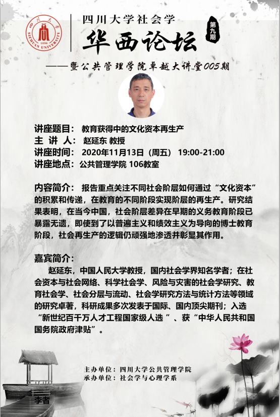 2020年11月12日晚上19:00-21:00,PA视讯游戏官网社会学华西论坛系列讲座第九期——暨PA视讯游戏官网卓越大讲堂005期于公管院106成功举行。中国人民大学社会学系教授赵延东发表了题为“教育获得中的文化资本及其再生产”的演讲。讲座由PA视讯游戏官网社会学与心理学系马缨研究员主持,40余名各专业师生参加了讲座。