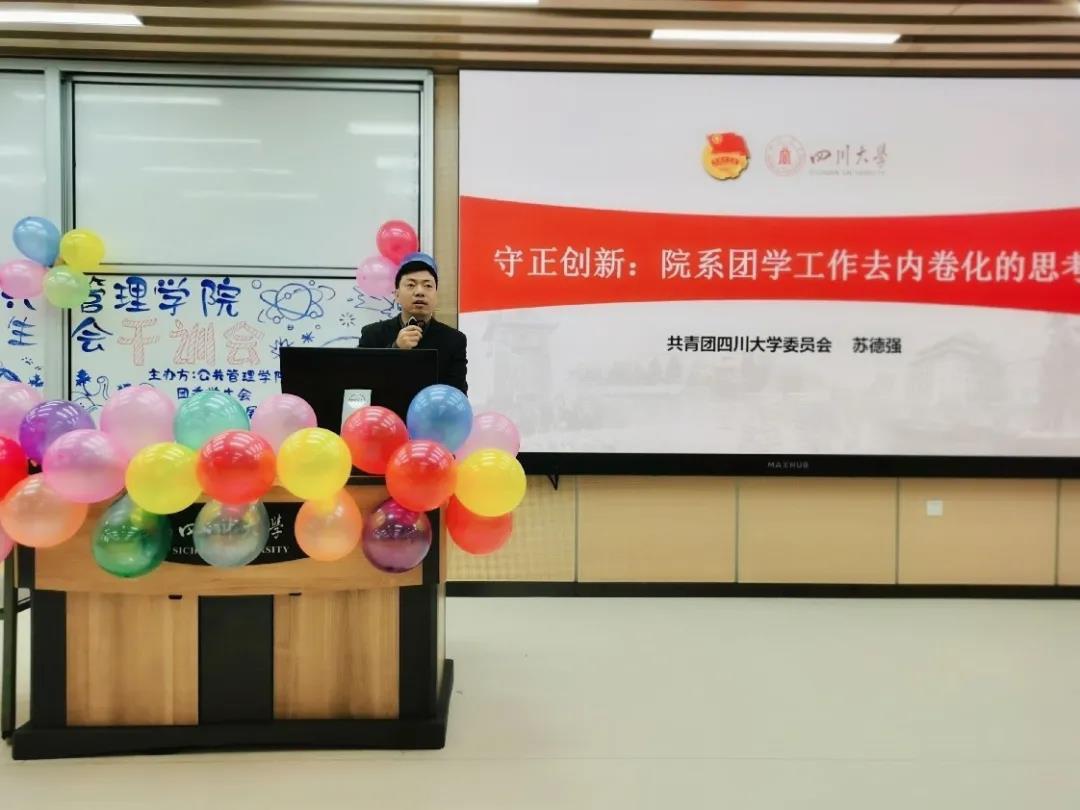 首先,苏德强老师以“守正创新:院系团学工作去内卷化的思考”为题为大家带来指导。苏老师指出了院系团学工作中存在的值得注意的倾向、阐释了“内卷”的概念与特点、点明了院系团学工作内卷化的典型特征,让全体参会人员对院系学生工作去内卷化有了更深的认识。苏老师在对PA视讯游戏官网团学工作给予充分肯定的同时,激励全体成员在今后的学生工作中能更好的引领服务、锻炼自我,发扬学院特色,将学院团学工作推向更高的台阶。