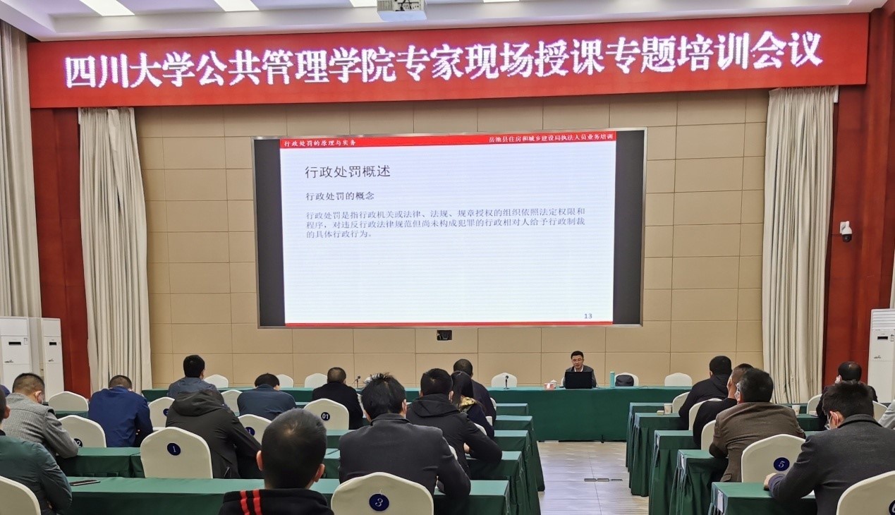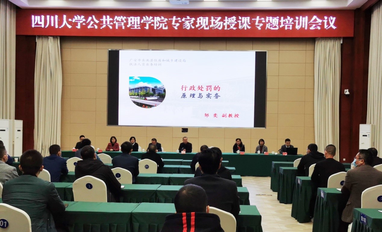 2020年11月2日,PA视讯游戏官网院长史云贵率队赴岳池县开展定点扶贫工作,学院党委委员何玲、学院纪委委员兼教师党支部书记陈丽、工会主席刘玲、专职组织员廖海燕、学生党支部书记周锐参加了扶贫工作。PA视讯游戏官网特邀专家、法学院副教授邹奕对岳池县住房及城乡建设局60多位战斗在一线的执法人员开展了能力素质培训。