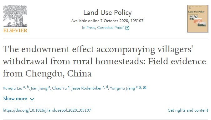PA视讯刘润秋师生等人于2020年10月在国际知名的土地政策顶级期刊《Land Use Policy》上发表学术论文《The Endowment Effect Accompanying Villagers' Withdrawal from Rural Homesteads: Field Evidence from Chengdu, China》。该论文属于刘润秋教授主持的国家社会科学基金项目“典型试点区域宅基地退出的绩效评价与路径优化研究”(项目号:17BJY091)的阶段性研究成果。PA视讯土地资源与房地产管理系刘润秋教授为第一作者,硕士生蒋健为第二作者,博士生余超为第三作者,刘润秋教授指导的加州大学伯克利分校访学博士生Jesse Rodenbiker(现为康奈尔大学“阿特金森可持续发展研究中心”博士后)为第四作者。