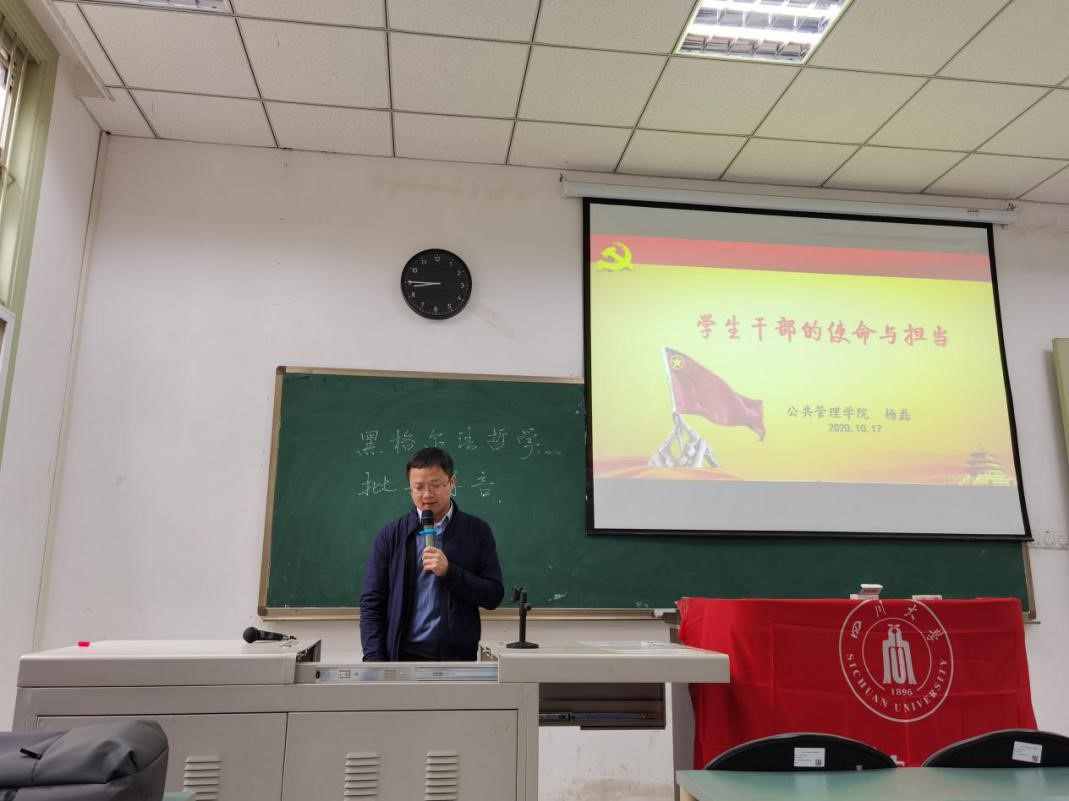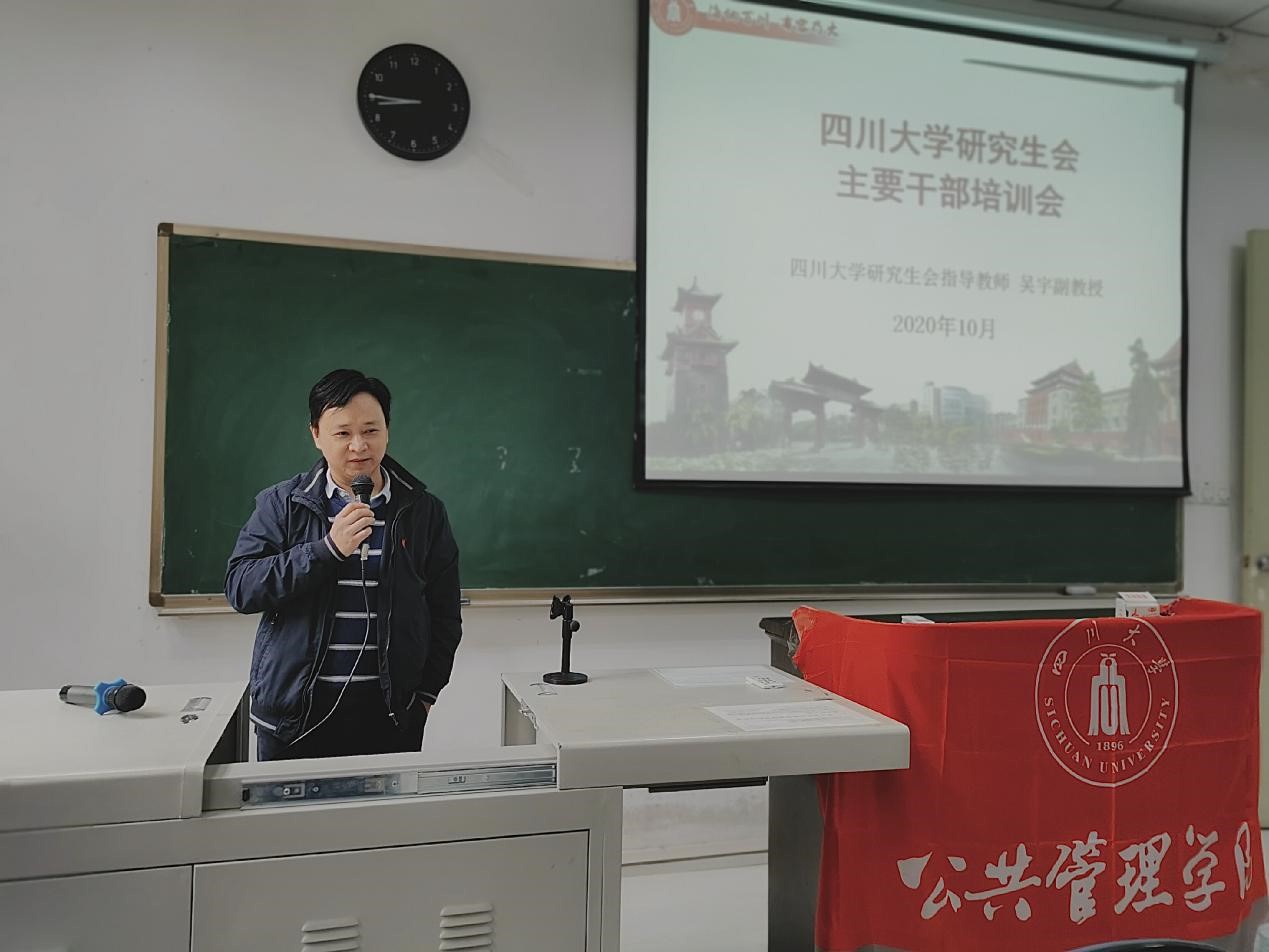 吴宇副教授以《如何做好研究生干部》为题,从为什么要做学生干部、怎样做好学生干部两方面出发,首先介绍了PA视讯游戏官网研究生会的指导思想、组织性质及干部的培养体系,接下来,吴宇副教授向参会学员强调,做好研究生会干部的核心是坚持研究生会干部自我管理,自我教育,自我服务。最后,吴老师希望研究生会干部具有过硬的政治素养,并对公管研究生会的学生干部提出了更高的要求。