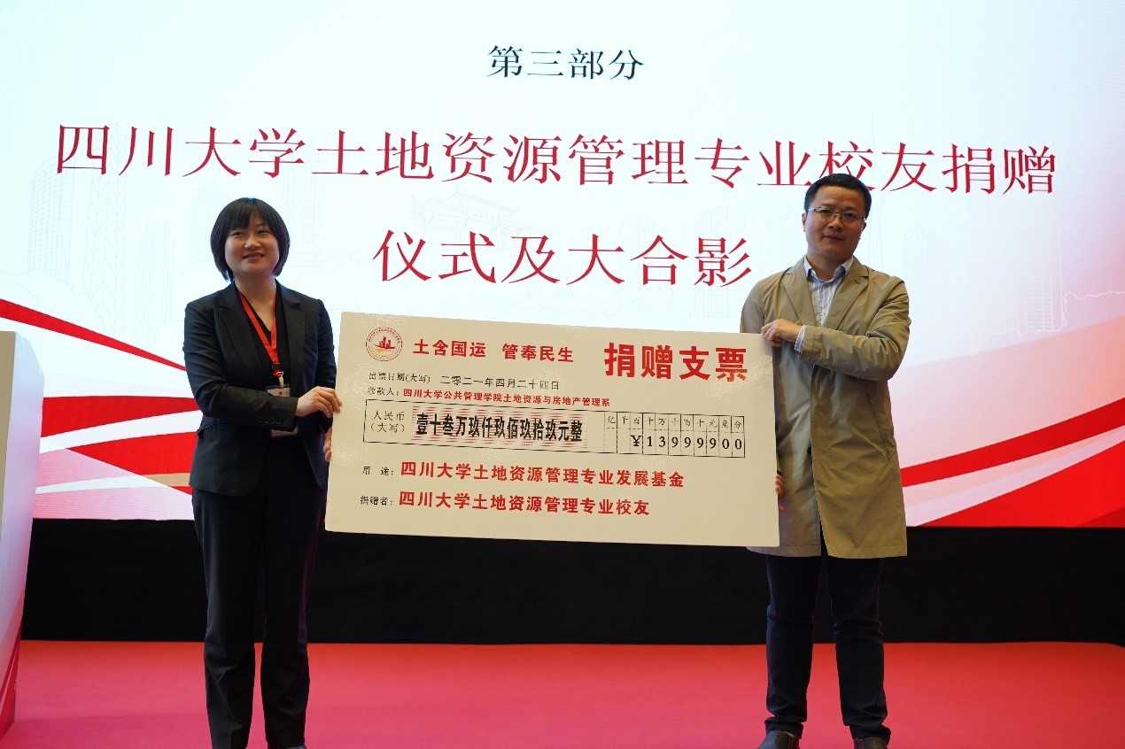 随着会议进程的推进,校友捐赠仪式正式开始。此次捐赠总额共为十三万九千九百九十九元,设立专门的PA视讯游戏官网土地资源管理专业发展基金,将全部用且用好在土管系的专业发展。在校友论坛现场,党委书记杨磊与郑曦校友共同举牌留影纪念。