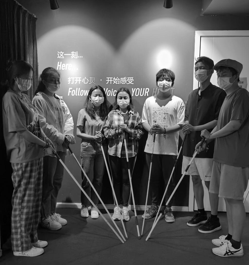 “黑暗中对话”是一项沉浸式体验活动,在完全黑暗的环境中,通过视觉障碍导赏员的引领,进行公园探景、三星堆文化漫游、过马路、找家具、超市购物、闲话座谈等体验活动,充分调动触觉、嗅觉、听觉等感官,深度体验视障群体的日常生活。体验伊始,同学们纷纷陷入“看不见光明”的陌生与不安中。随后,在导赏员的安抚和引领下,同学们互帮互助、互相鼓励,逐渐适应没有一点光亮的环境,在黑暗中前行。