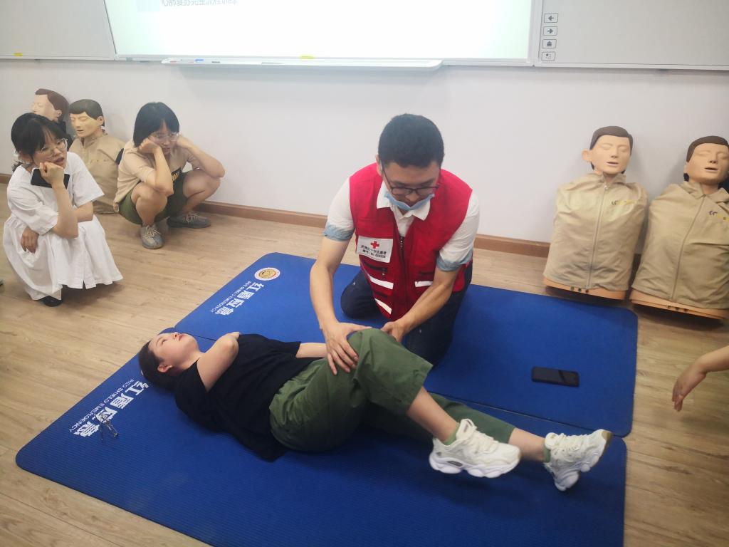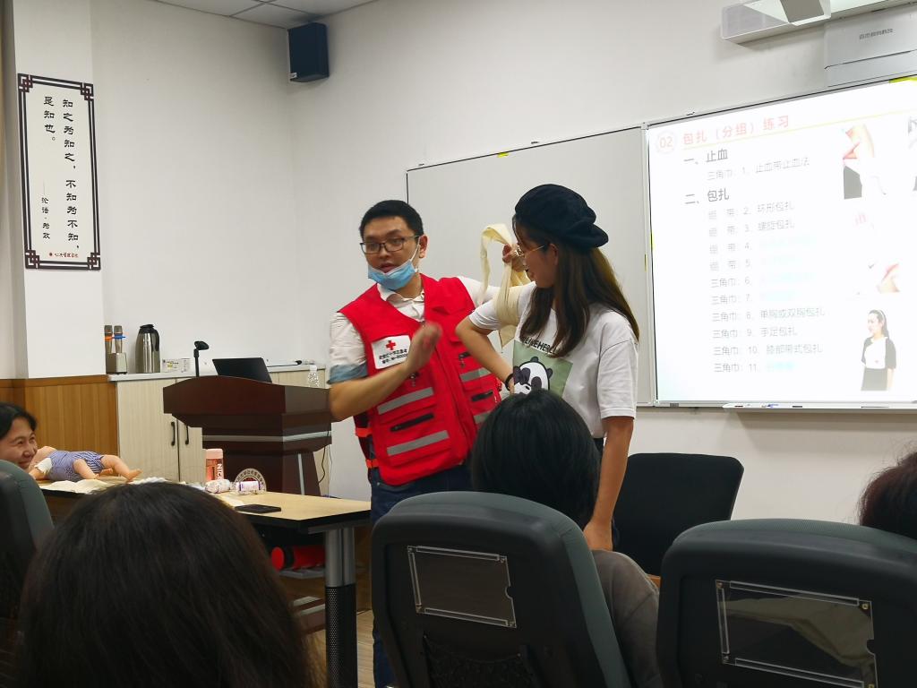 接下来的课程中,林老师针对受伤出血或骨折的情况进行创伤救护,系统示范了止血、包扎、固定的方法。而后,同学们两两一组进行训练,老师一一进行指导、考核和点评。课程最后,所有参训同学均通过了理论考试和实操考核,获得“红十字救护员证”。