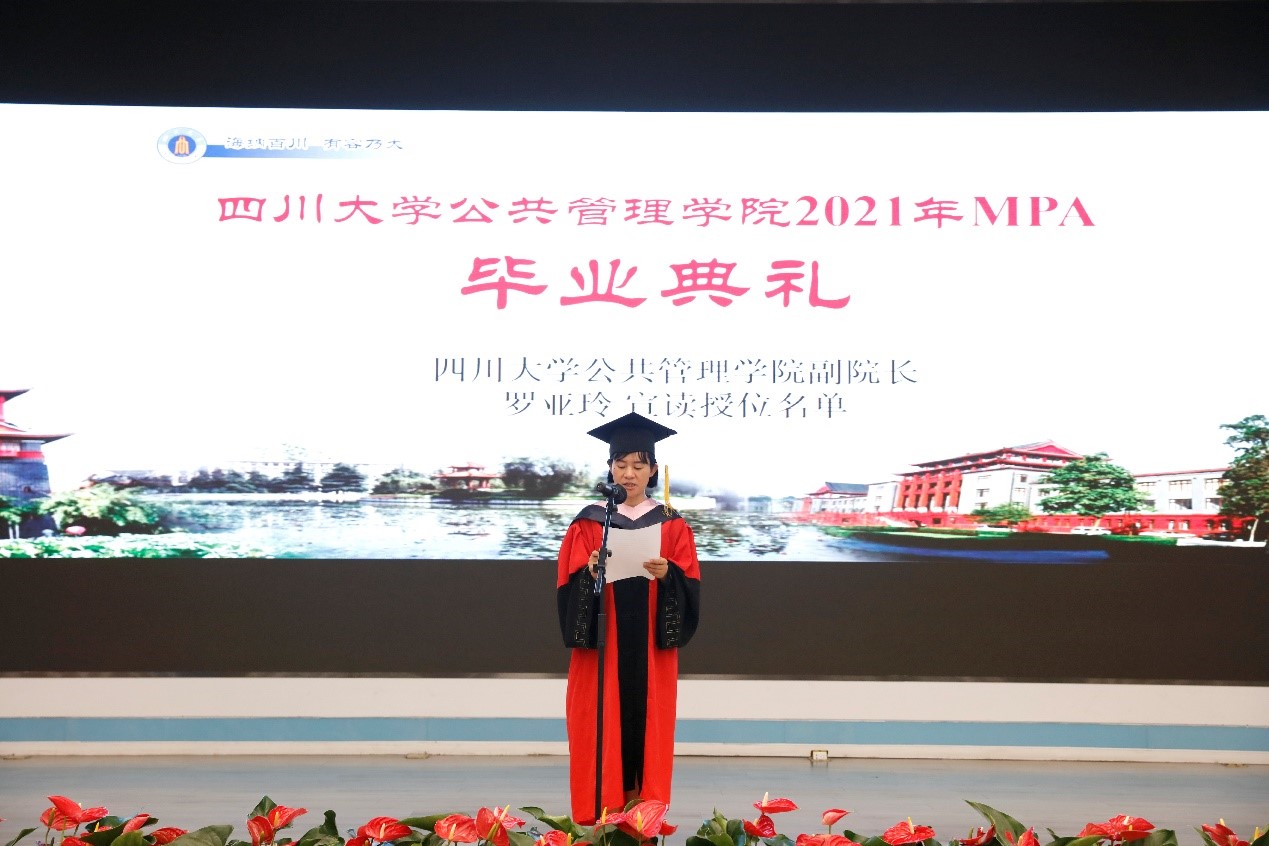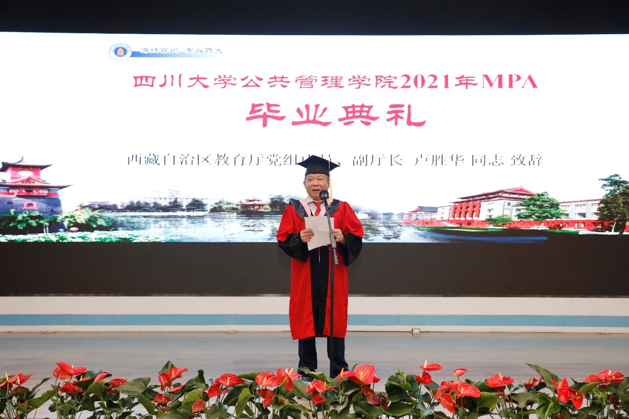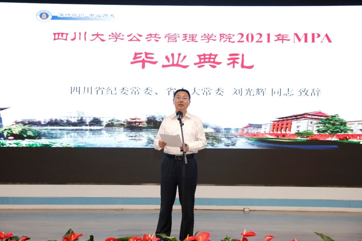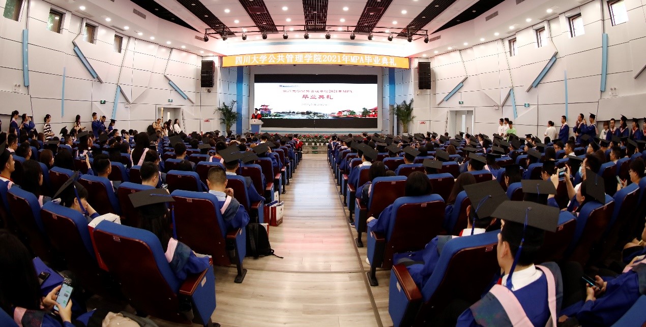 2021年7月10上午9点30分,PA视讯游戏官网2021年公共管理硕士(MPA)毕业典礼在PA视讯游戏官网东区三教演播厅隆重举行。出席典礼的领导及嘉宾有:PA视讯游戏官网党委副书记郭勇教授,四川省纪委常委、省人大常委刘光辉同志,西藏自治区教育厅党组成员、副厅长卢胜华同志,全国MPA教指委委员、PA视讯游戏官网党委书记姜晓萍教授、PA视讯游戏官网党委副书记杨磊老师、PA视讯游戏官网副院长罗亚玲副教授、PA视讯游戏官网MPA导师及任课教师、各班班主任以及行政老师、2020年和2021年MPA毕业生以及部分毕业生家属。典礼由PA视讯游戏官网副院长夏志强教授主持。