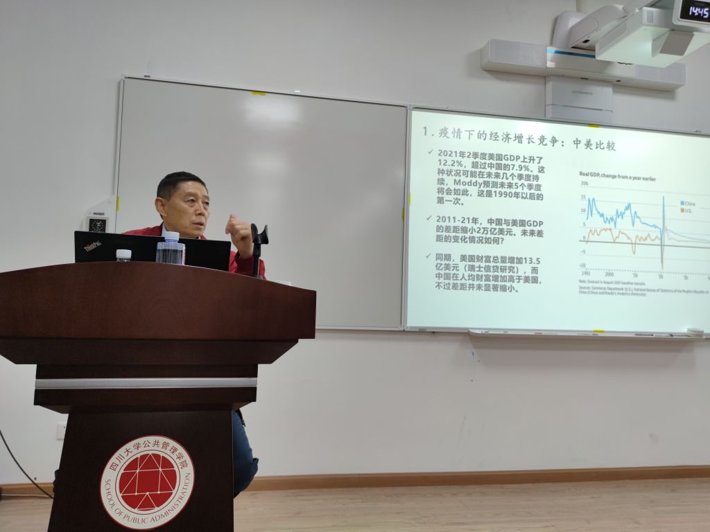 在新冠疫情常态化和美国对华战略挤压的背景下,地缘政治冲突、文化冲突、意识形态冲突、民族主义冲突频发。面对这些问题,世界上的主要国家多采取各自为政的举措,导致全球难以携手合作,国际关系愈发紧张。俞樵教授认为,建设更遵循国际秩序、更开放包容、更高质量发展的开放经济才是破局的理性选择,而进行高水平的金融市场开放则是重中之重。俞樵教授通过几组图表和数据为同学们展示了宏观背景之下国际经济的几大特点:一是疫情后的中美经济增长竞争,美国自1990年后首次GDP增长率超过中国;二是在扩张性货币政策、经济全球化、电子商务发展及人口老龄化的影响下,全球价格水平上涨;三是疫情的流行使得政府债务达到二战以来的最高峰,国债总量增加而利率下降;四是全球市场现金充裕,全球投资的调整有待考量。