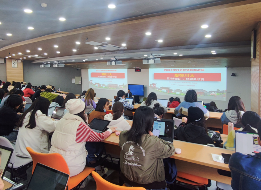 课程在愉快的氛围中拉开帷幕。党老师与同学们友好互动,提问同学何为川大校训与川大精神,并为同学提供了惊喜小礼物。党老师利用播放校歌的形式,深刻解读了川大“严谨、勤奋、求是、创新”为核心的川大精神,阐释了“海纳百川,有容乃大”这一校训的深刻内涵。