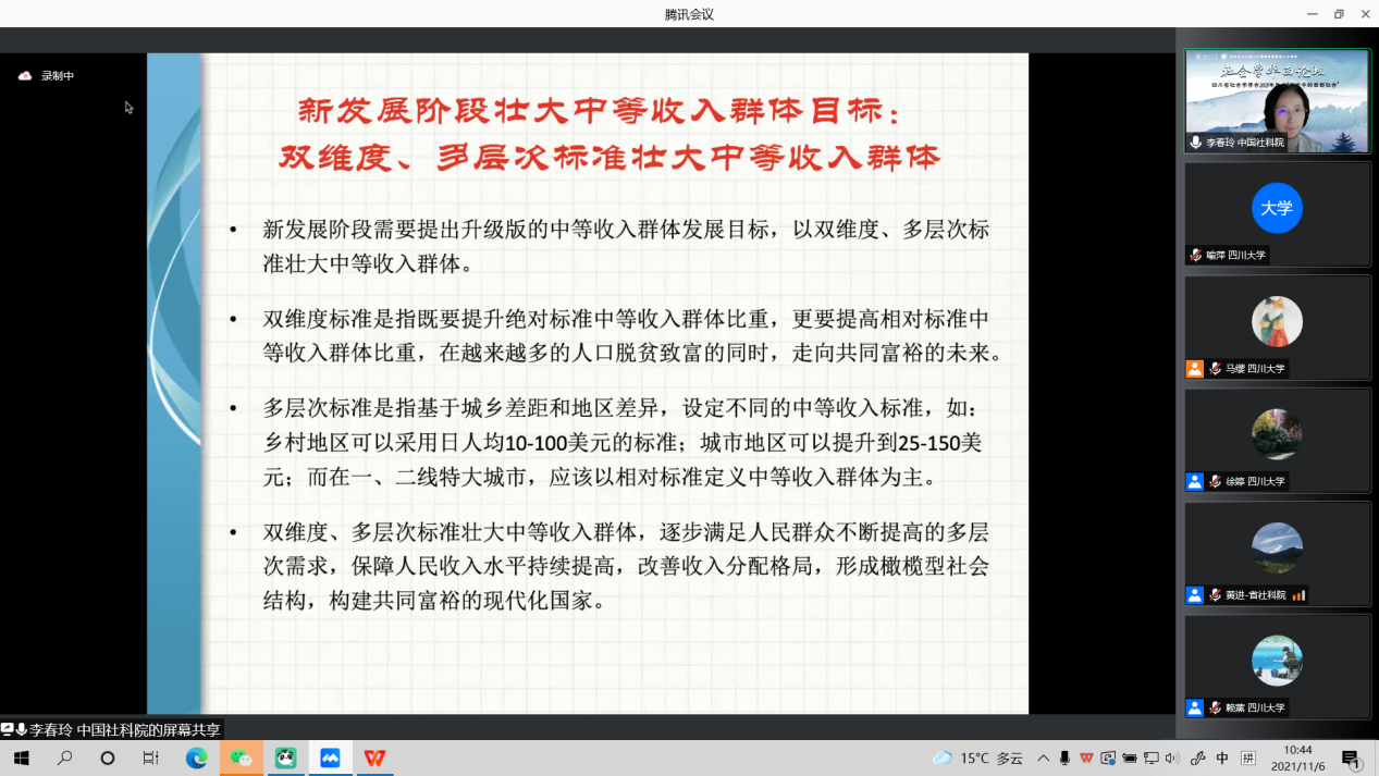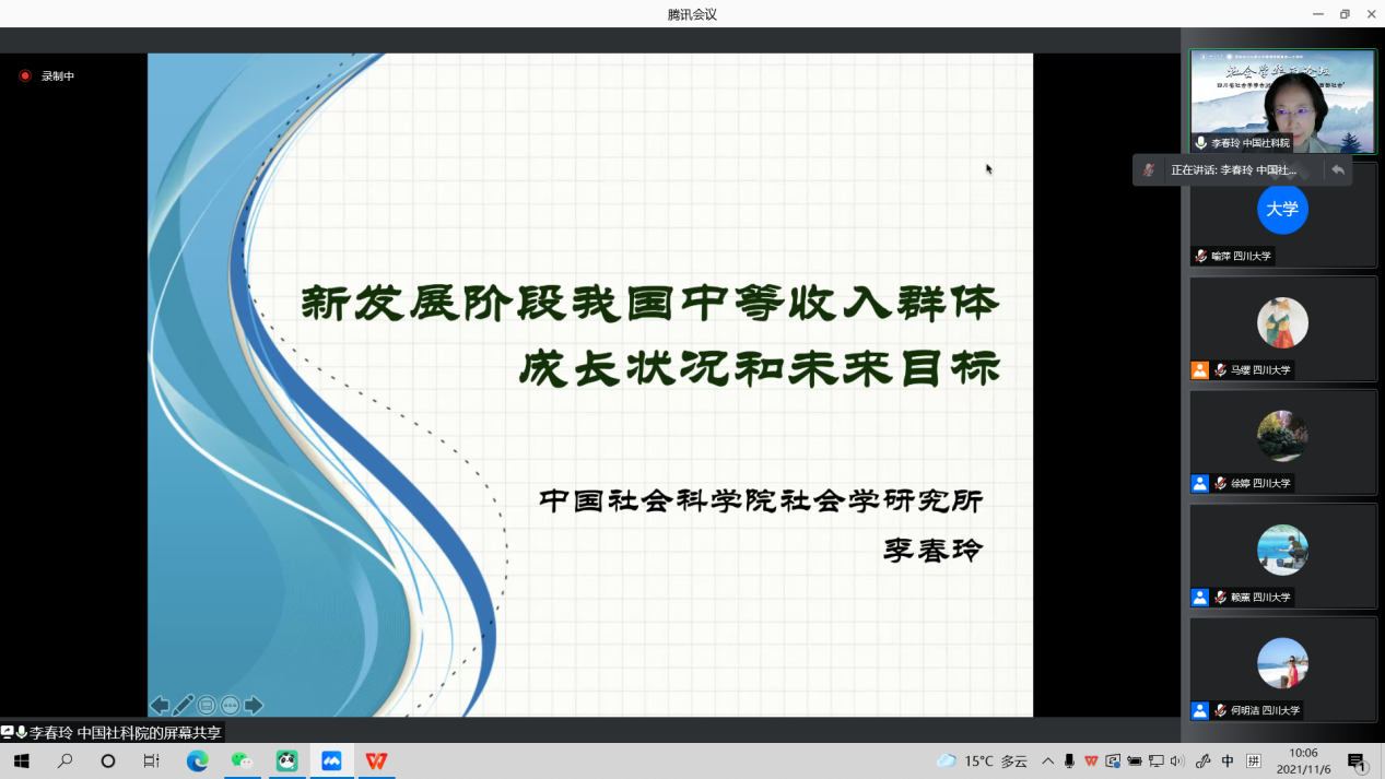 2021年四川省社会学年会于11月6日在PA视讯游戏官网召开,此次会议采取线上的方式举行,有近200人参与了此次年会。中国社会科学院社会学研究所研究员、博士生导师、青少年与社会问题研究室主任李春玲在大会上围绕“新发展阶段我国中等收入群体成长状况和未来目标”做了主题发言。