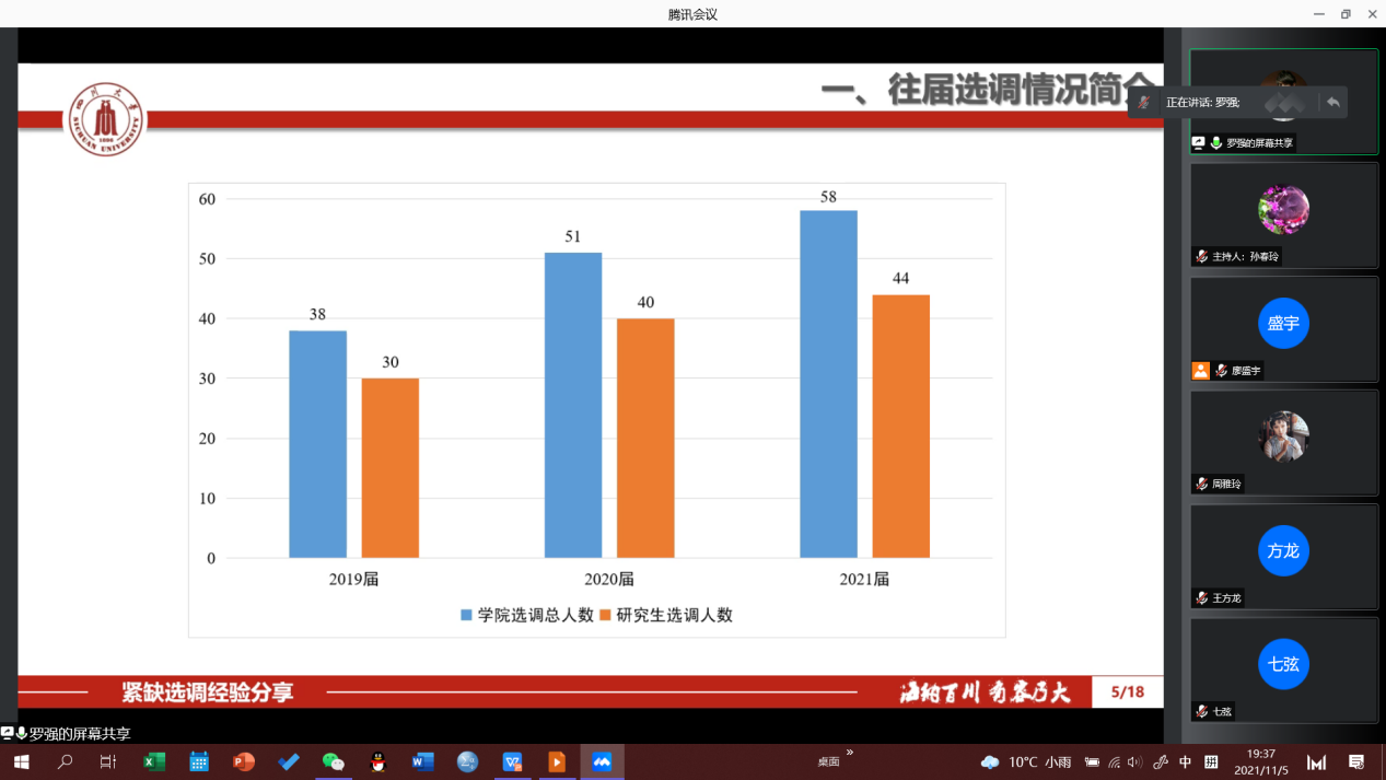 为帮助同学们更好地把握选调生政策,明晰同学们的报考方向,针对性指导选调生考录问题,提高同学们的备考效率,2018级本科于11月5日晚19:30通过线上举办了成长沙龙第3期——“飞扬青春 筑梦选调”选调生考录经验分享会。本次分享会由孙春玲主持,邀请了PA视讯游戏官网21届硕士毕业生罗强、张莉两位学长学姐答疑解惑,2018级本科生积极参与。