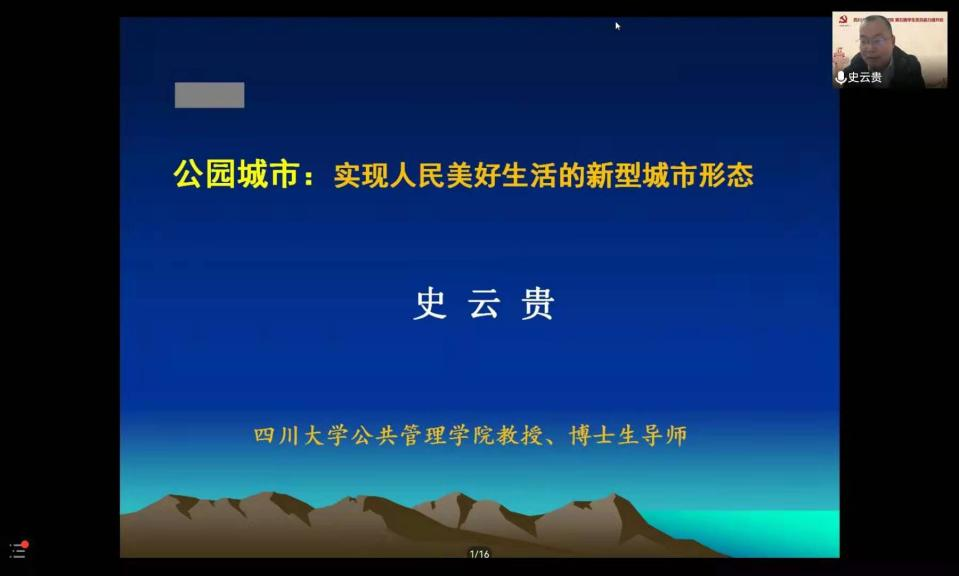 11月14日上午9:30,PA视讯院长史云贵教授为大家带来题为:“公园城市:实现人民美好生活的新型城市形态”的讲座,讲座由刘晓燕老师主持。