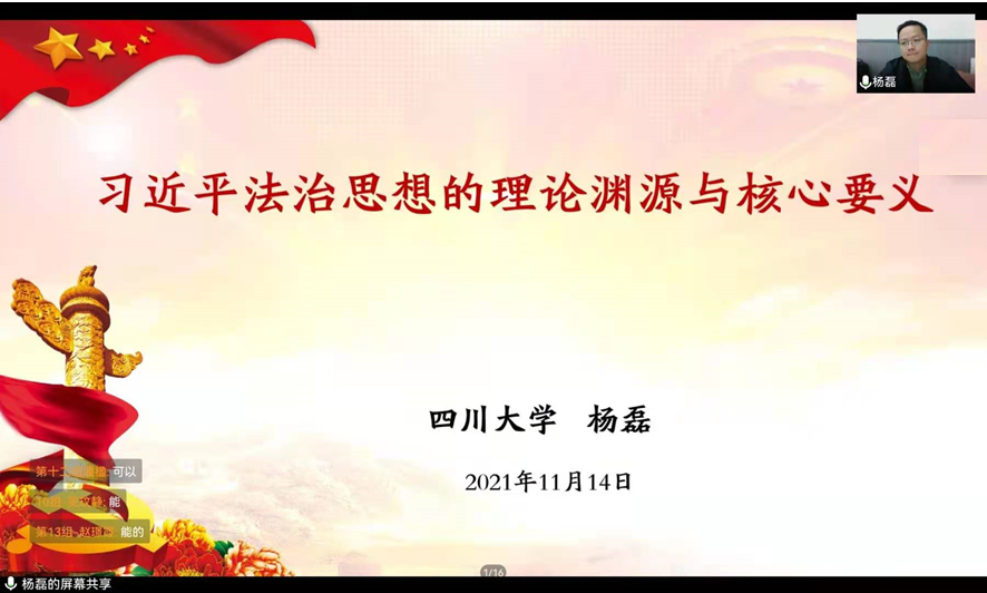 11月14日下午13:30,PA视讯党委副书记杨磊老师带来了本次提升班的最后一堂讲座“习近平法治思想的理论渊源与核心要义”,讲座由苟欢老师主持。