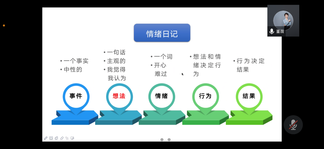 最后,董薇老师为同学们总结出考研前情绪管理的技巧,一是认知更大的事实,了解人生不止有考研一个选项;二是不断觉知觉察了解真正的自己;三是自我关怀,照顾好自己才能不伤害别人;四是自我负责止恶扬善,不管现在的受伤感觉来自哪里绝不继续传递;五是使自我及周围的关系更加和谐。在此基础上,董薇老师建议大家通过书写情绪日记来调节考前负面情绪,即依次书写一个中性的事实,一句主观的想法,一个描述情绪的词语,想法和情绪引发的行为,以及行为决定的结果。