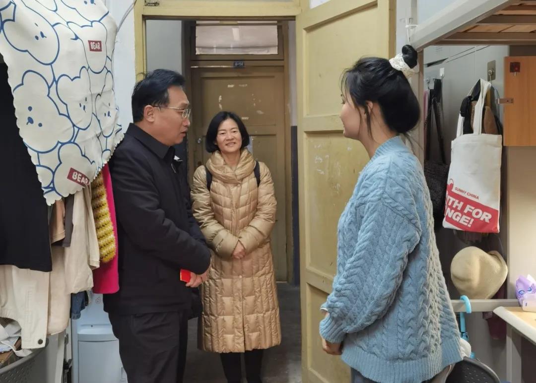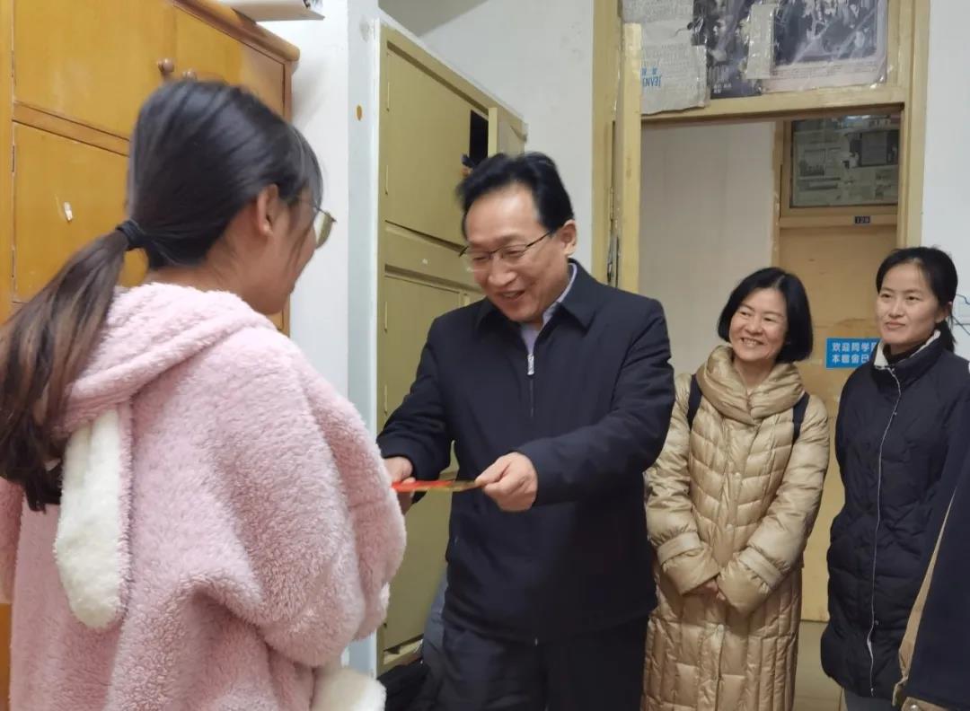 1月29日,伴着蓉城久日不见的和煦暖阳,PA视讯党委书记韩杰、党委副书记罗亚玲一行走访慰问留校学生,代表学院关心留校学生学习、生活情况,为学生送去节日的问候和新春的祝福,同行人员还有团委书记青杨媚、学生科副科长陈萱源。