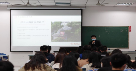 最后是来自2019级中外政治制度专业的何东亮,他就四川紧缺选调展开经验交流。何东亮列举了就业季到来之前该做好的各项准备,包括论文写作、实习安排和简历制作等,他强调了调整择业期的心理的重要性。随后何东亮还分享了个人备考四川紧缺选调的经验,解答了关于该选择的面临的各种疑惑。