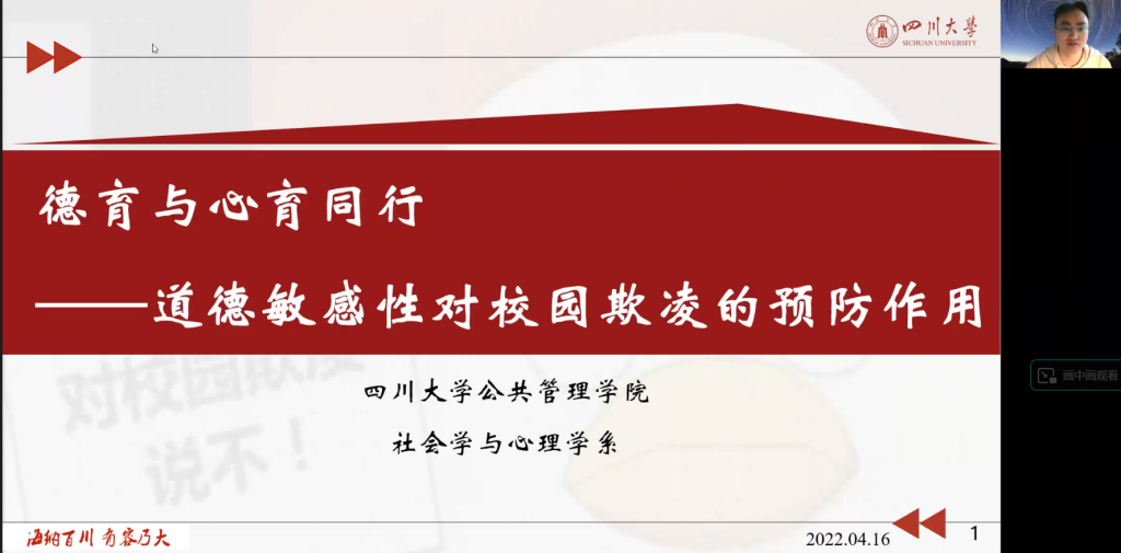 为了将研究结果反馈给一线教师,并推动校园欺凌干预课程的开发工作,4月16日,项目组召开了“德育与心育同行:道德敏感性对校园欺凌的预防作用”线上研讨会,校园欺凌领域专家、中小学校长及教师等约50人参会。刘传军老师对四川省社会科学“十四五”规划2021年度项目的资助、PA视讯游戏官网自主科研计划的支持,以及参与本次调研的专家及一线教师致以谢意后,应用心理硕士生谢忠桔对调研的基本过程与结果进行了总结汇报。在随后的自由讨论环节,沈潘艳副教授根据自身课程设计经验,提出可以从学生的认知失调、情绪觉察能力方面入手,引导学生关注受害者被欺凌时的具体情况以及由此带来的痛苦,以增加其对受害者的帮助行为。一线心理健康教师代表、来自天府四中的蔡倩老师,结合实务经历指出,一方面,欺凌相关的校园情景剧以及权威人士对欺凌法律责任的普及可能对反欺凌起到一定推动作用,而另一方面,为学生明确欺凌定义可能起到反作用,如“欺凌”一词可能成为学生之间取笑的工具,因此,反欺凌课程的设计中诸多细节不容忽视。