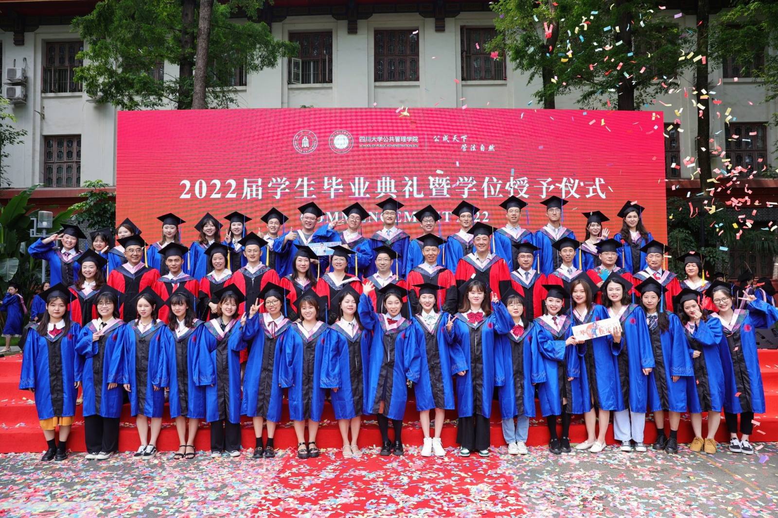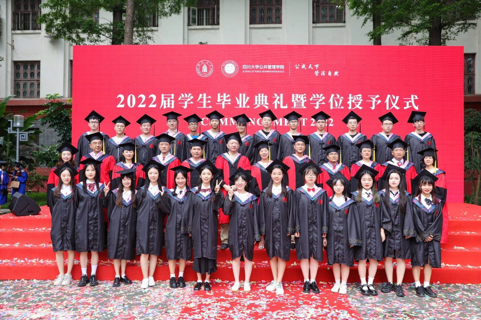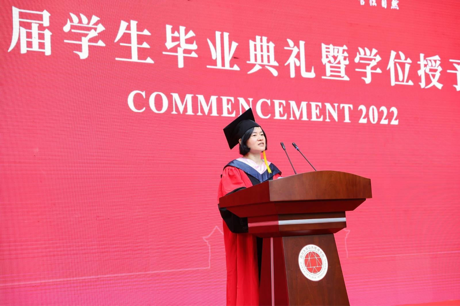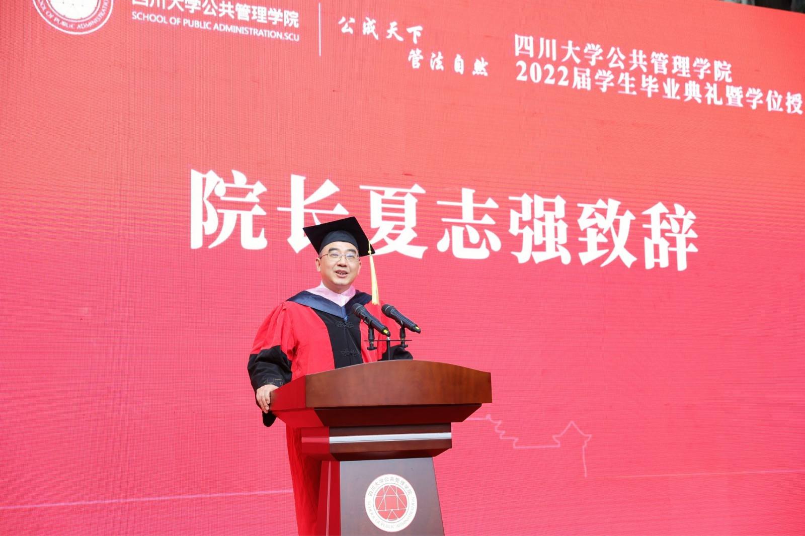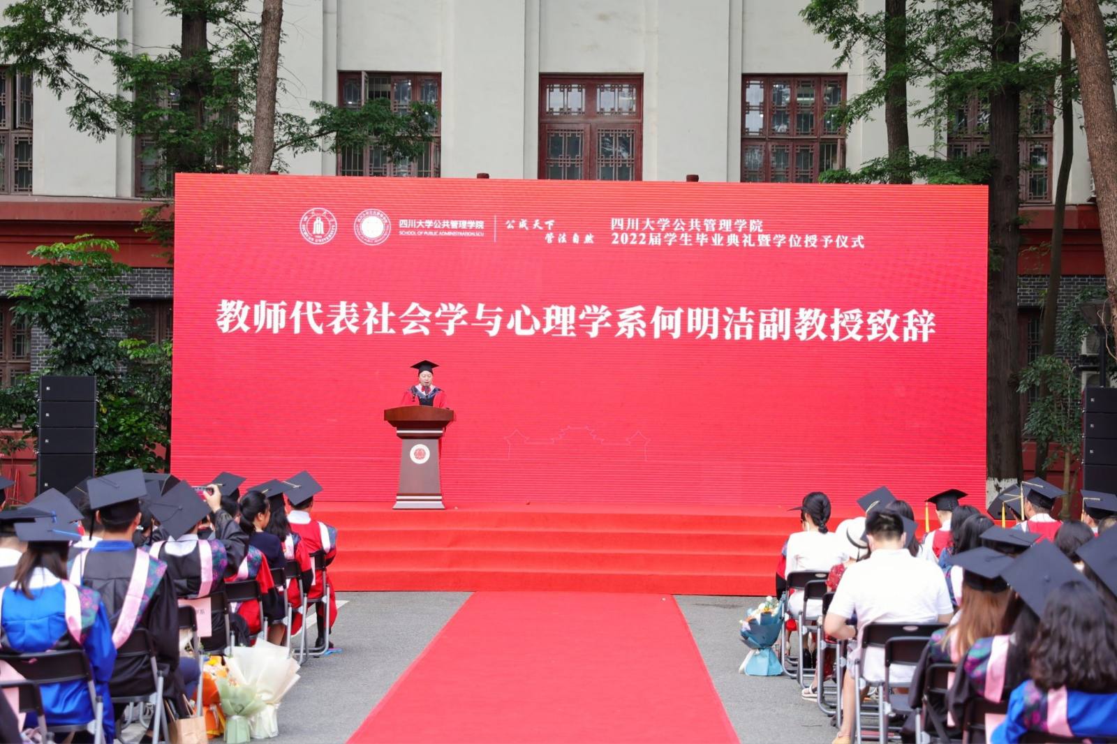 学生代表2022届本科毕业生徐宇航同学在发言中感恩学院的培养、老师的教诲、同学的陪伴,表示将记住老师们的嘱咐,并将“公成天下,管法自然”的院训撒播四方。校友代表、中共成都市委办公厅会议处处长、2013届MPA毕业生邓冰梅在发言中祝贺学弟学妹们顺利毕业,并以自己的成长经历鼓励学弟学妹在奔往人生新征程中不怕苦累、勇敢前行。