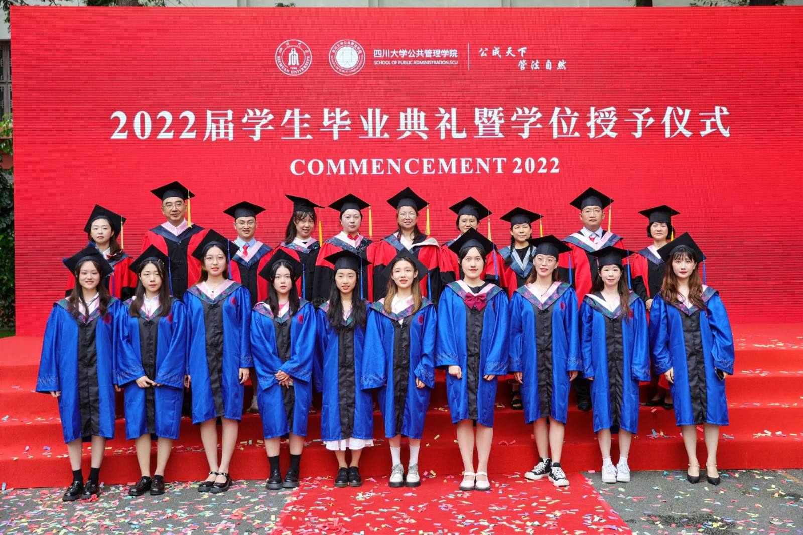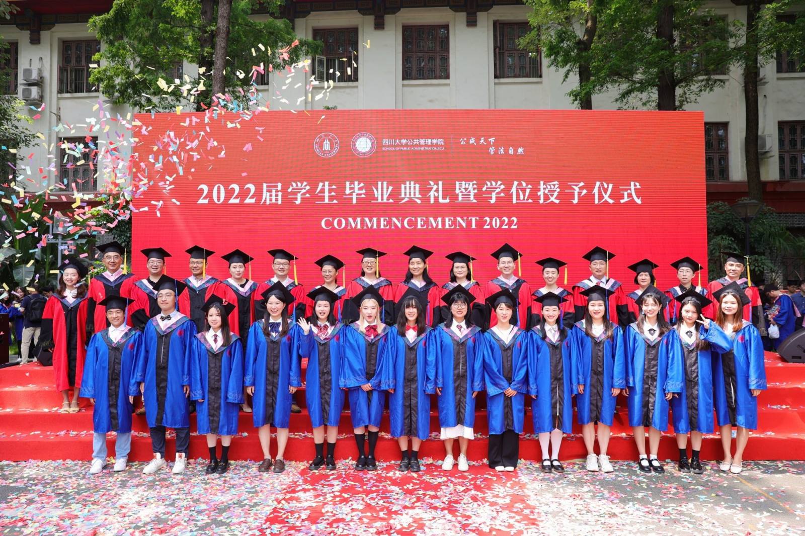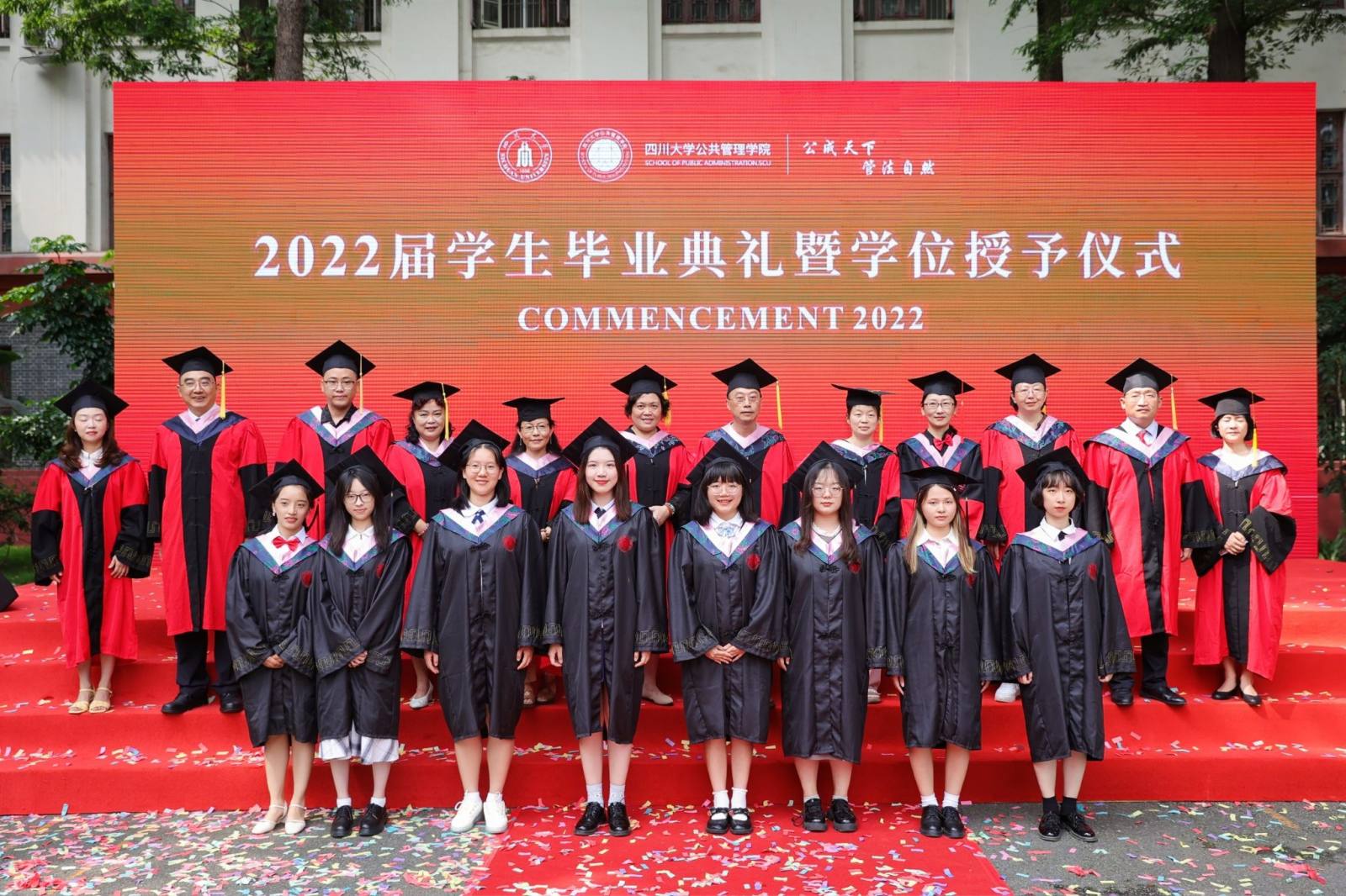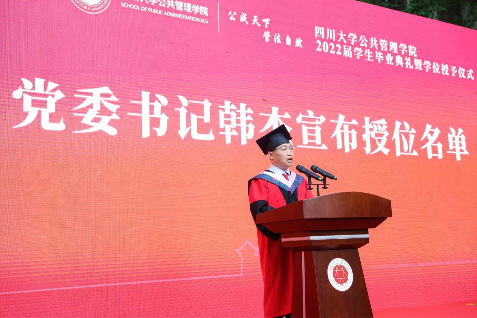学生代表2022届本科毕业生徐宇航同学在发言中感恩学院的培养、老师的教诲、同学的陪伴,表示将记住老师们的嘱咐,并将“公成天下,管法自然”的院训撒播四方。校友代表、中共成都市委办公厅会议处处长、2013届MPA毕业生邓冰梅在发言中祝贺学弟学妹们顺利毕业,并以自己的成长经历鼓励学弟学妹在奔往人生新征程中不怕苦累、勇敢前行。