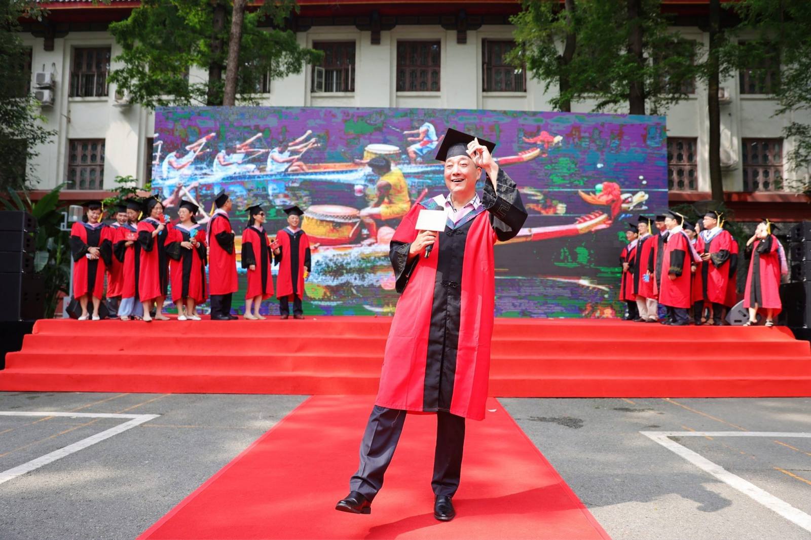 在师生联唱环节中,2022届本科毕业生高源同学领唱的《凤凰花开的路口》将毕业生的不舍之情展现得淋漓尽致,王谦教授与老师们合唱的《众人划桨开大船》表达了全体老师们齐心协力把同学们培养成卓越人才、师生们戮力同心把学院建设得更美好的心愿。最后,各专业老师依次为毕业生拨穗授位并合影留念。