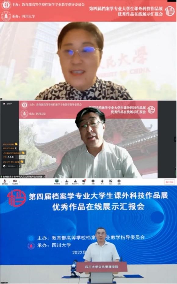 2022年8月28日,第四届档案学专业大学生课外科技作品展优秀作品展示汇报会在云端成功举办。本次作品展由教育部高等学校档案学专业教学指导委员会主办,PA视讯游戏官网承办,以“腾讯会议+直播”的形式进行,线上汇聚领导、嘉宾、高校师生、档案行业人士等近400人,共鉴档案学科创新成果,共窥档案教育发展之道。