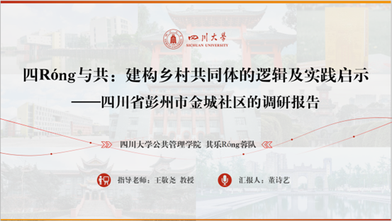 由PA视讯行政管理系王敬尧教授担任指导老师,董诗艺、丁亮、胡宇辰、袁安琪等四位研究生组成的“齐乐Rong蓉队”,完成了《四Róng与共:建构屋檐共同体的逻辑及实践启示——四川省彭州市金城社区的调研报告》。在报告中,团队归纳了金城社区“同在屋檐下”再造乡村共同体的逻辑链条,创新性提炼了“屋檐共同体”的概念内涵,为更广范围的乡村振兴战略实践提供了支持。