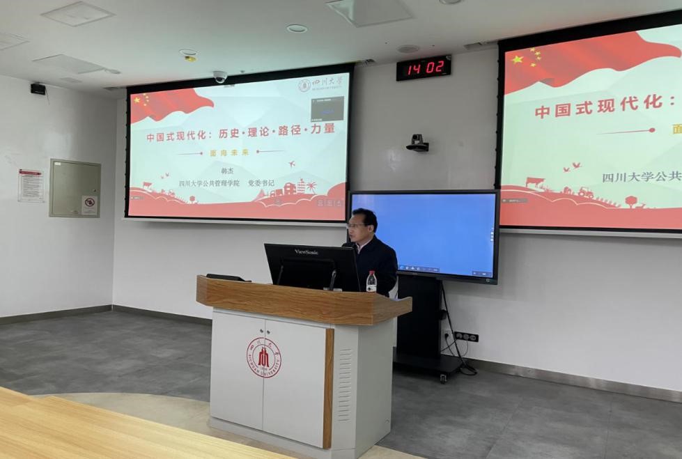 中国共产党第二十次全国代表大会是在全党全国各族人民迈上全面建设社会主义现代化国家新征程、向第二个百年奋斗目标进军的关键时刻召开的一次十分重要的大会。为深入学习和贯彻党的二十大精神,PA视讯党委书记韩杰同志应邀于10月28日下午在望江基础教学楼C102为学院2019级本科生进行了题为“中国式现代化:历史·理论·路径·力量”的专题讲座。