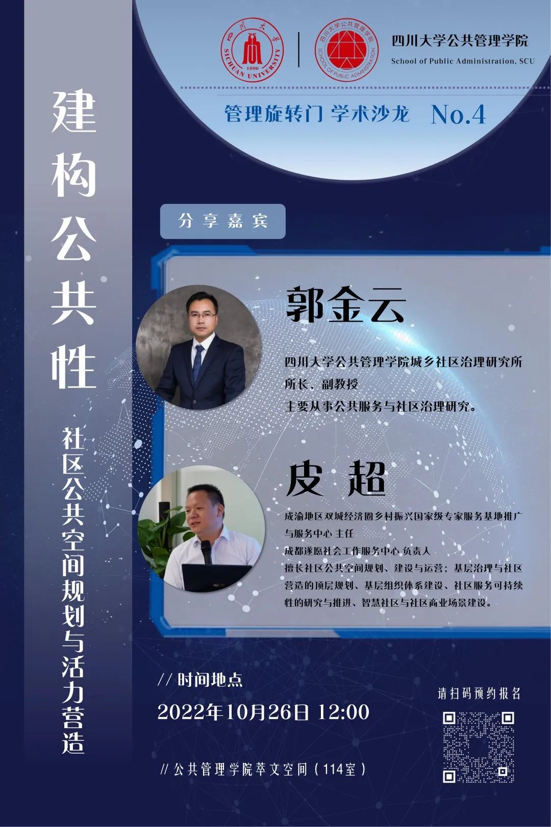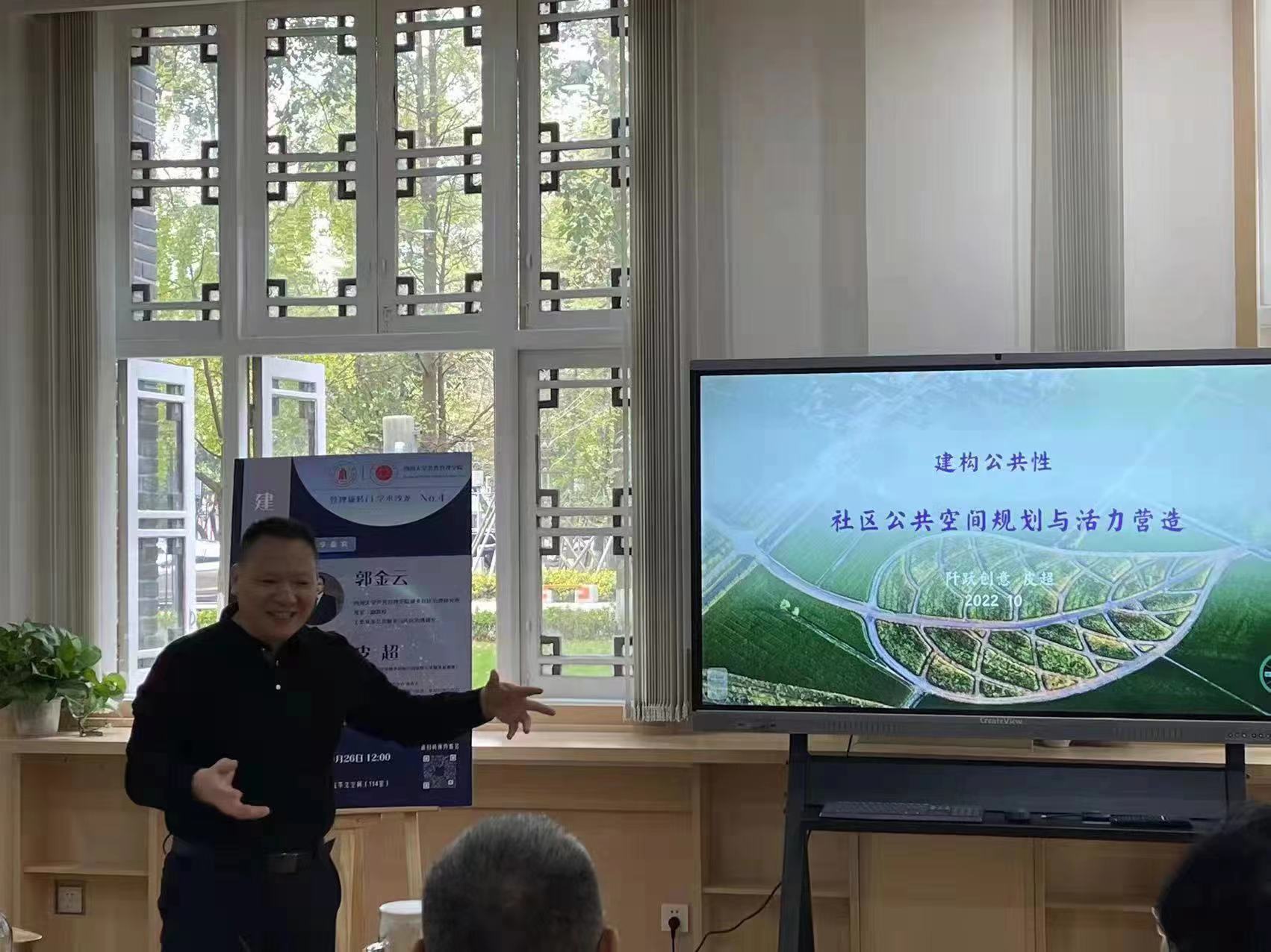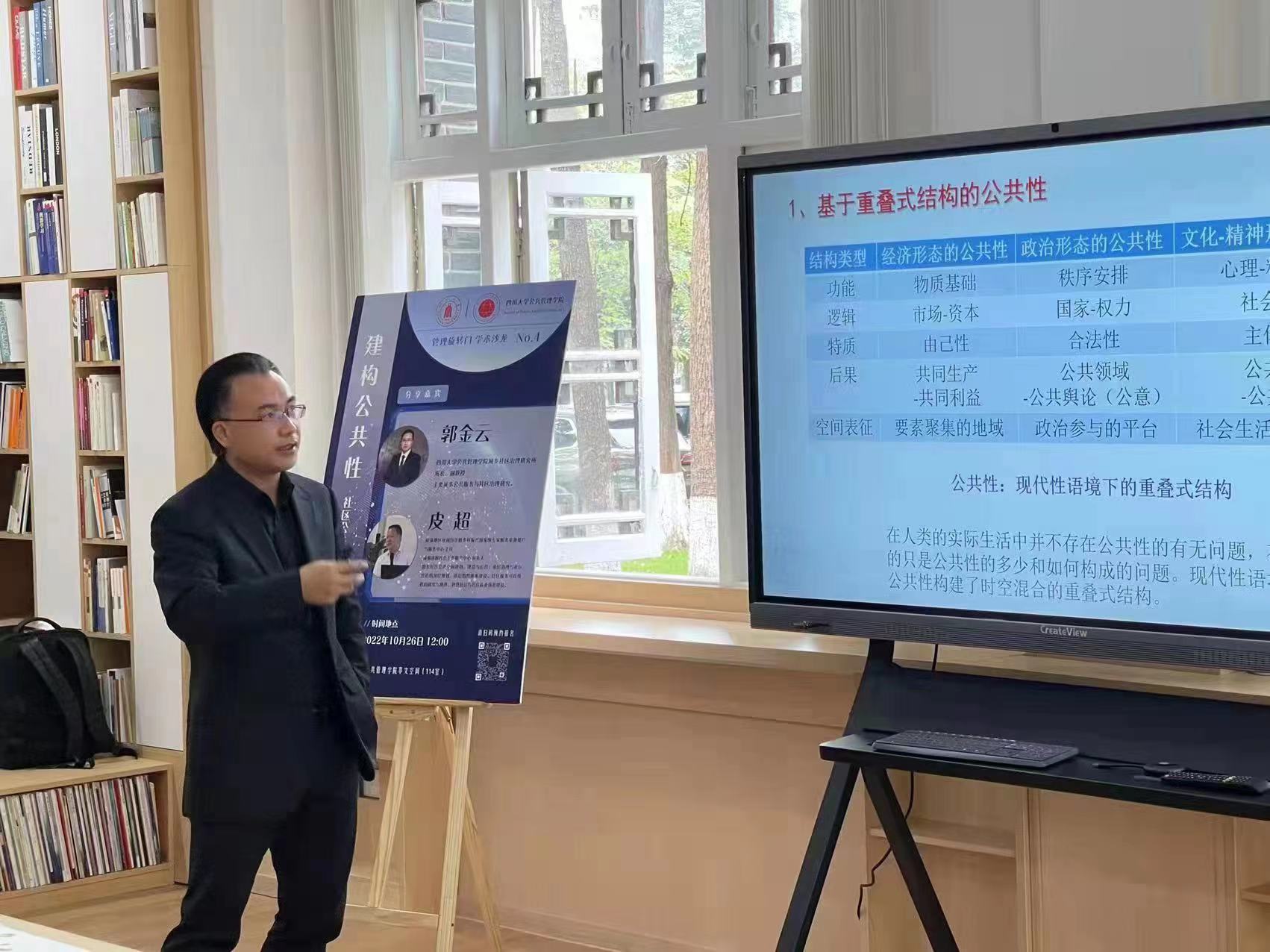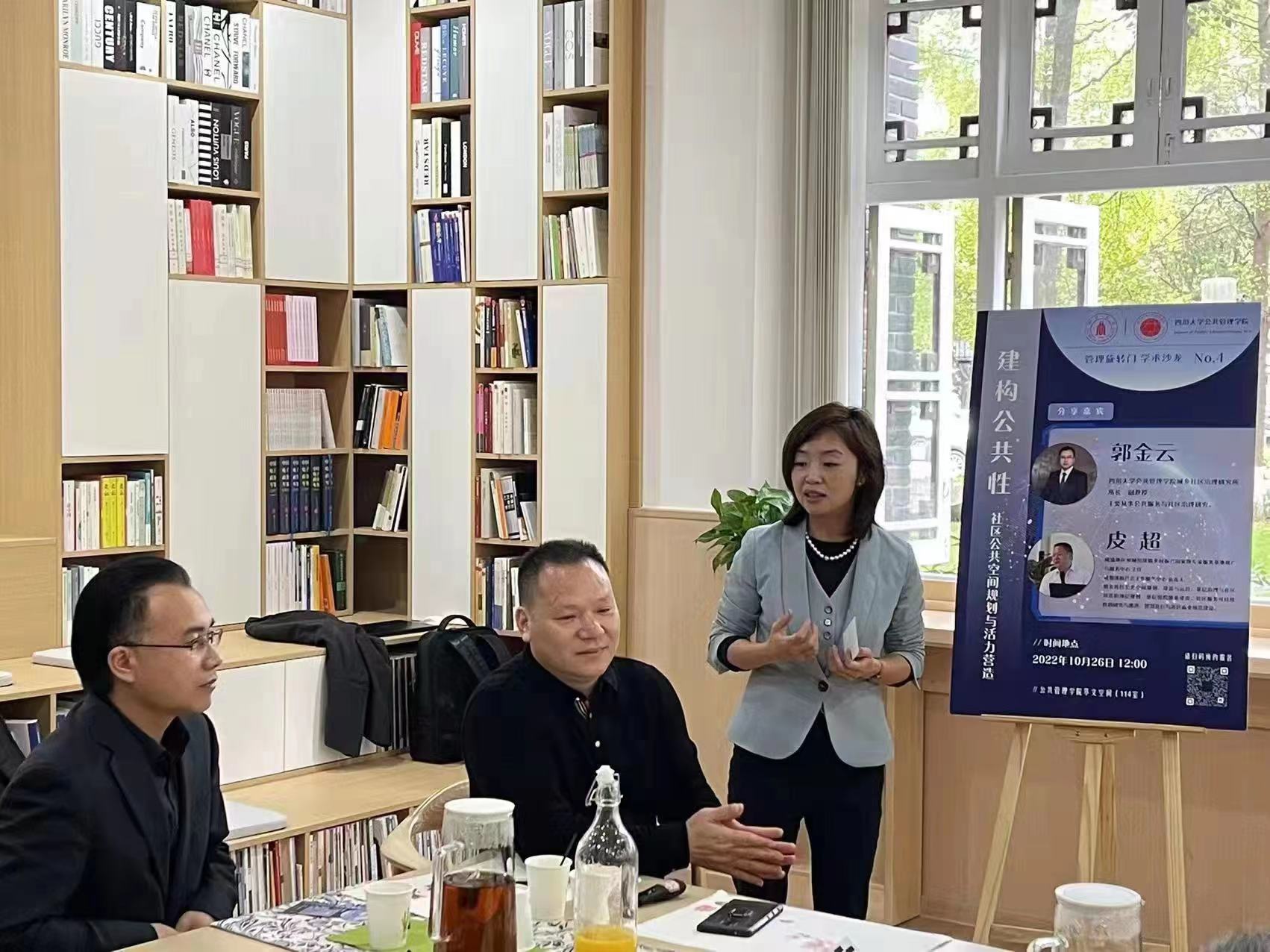 2022年10月26日,“管理旋转门”第四期学术沙龙在学院共享空间(萃文空间)举行。本次活动特邀成渝地区双城经济圈乡村振兴国家级专家服务基地推广与服务中心主任、成都遂愿社会工作服务中心负责人皮超,PA视讯城乡社区治理研究所所长、行政管理系郭金云副教授共同作为分享嘉宾,开展题为“建构公共性:社区公共空间规划与活力营造”的主题交流。
