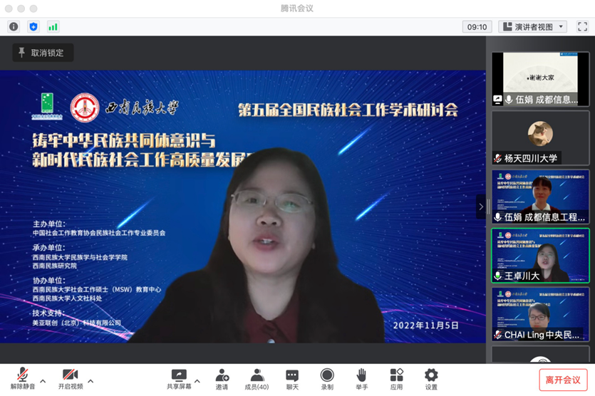 2022年11月15日,为深入研究新时代民族社会工作的重大理论和实践问题,激发民族社会工作领域专家学者和在校研究生的学术兴趣,提高民族社会工作研究水平,由中国社会工作教育协会民族社会工作专业委员会、西南民族大学联合举办的第五届全国民族社会工作学术研讨会在成都顺利举行。