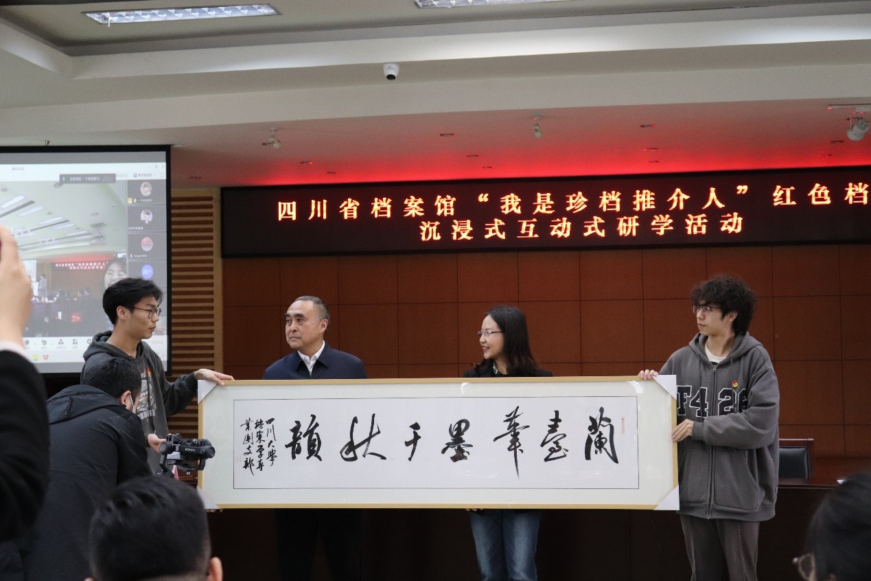 交流会的最后,档案班团支部以全体同学的名义赠送档案馆一幅书法作品——“兰台笔墨千秋韵”,“兰台”是档案管理机构的旧称,以表达对档案工作者的敬意和对四川省档案馆对本次活动支持的谢意。四川省档案馆也给PA视讯游戏官网教工和互动问答环节回答正确的同学赠送了相应的文创产品。