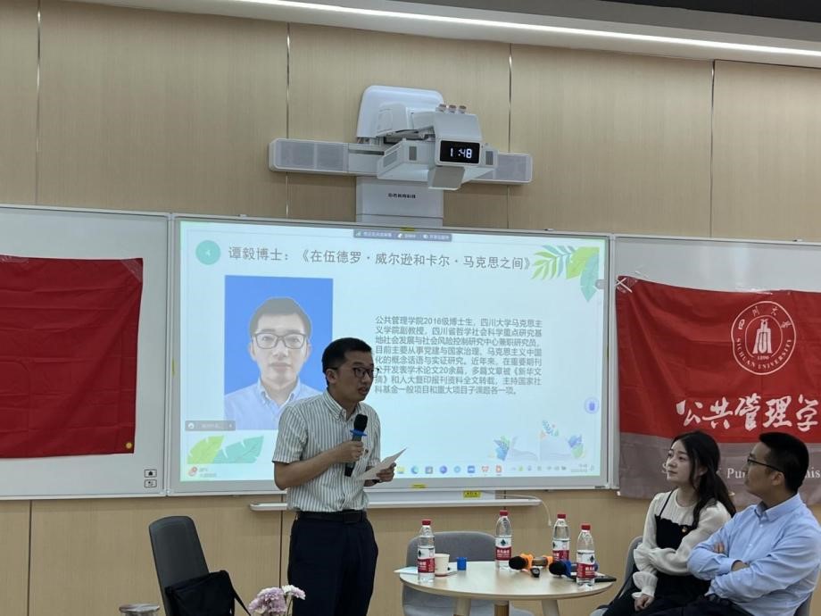 接着,PA视讯2016级博士生、PA视讯游戏官网马克思主义学院副教授谭毅以《在伍德罗·威尔逊与卡尔·马克思之间》为主题,向同学们介绍了跨学科研究的经验与思考。他分别从学科属性、研究议题、话语指向与工具方法等角度解析了马克思主义研究与公共管理研究的分界线与耦合点,分享了他在做跨界研究中的心路历程。