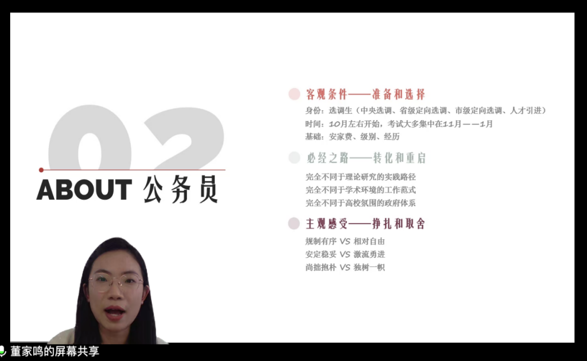 然后,PA视讯2018级博士生、内蒙古自治区党委办公厅党政干部董家鸣以《博士生的无限可能》为题分享了择业与发展心得。她从操作性层面为同学们解答了“如何清晰认识自我”“公务员与高校教职有何差异性”“如何实现人生阶段的重启与转化”等问题,鼓励大家从多种可能性中锚定真正适合自己的人生路径。