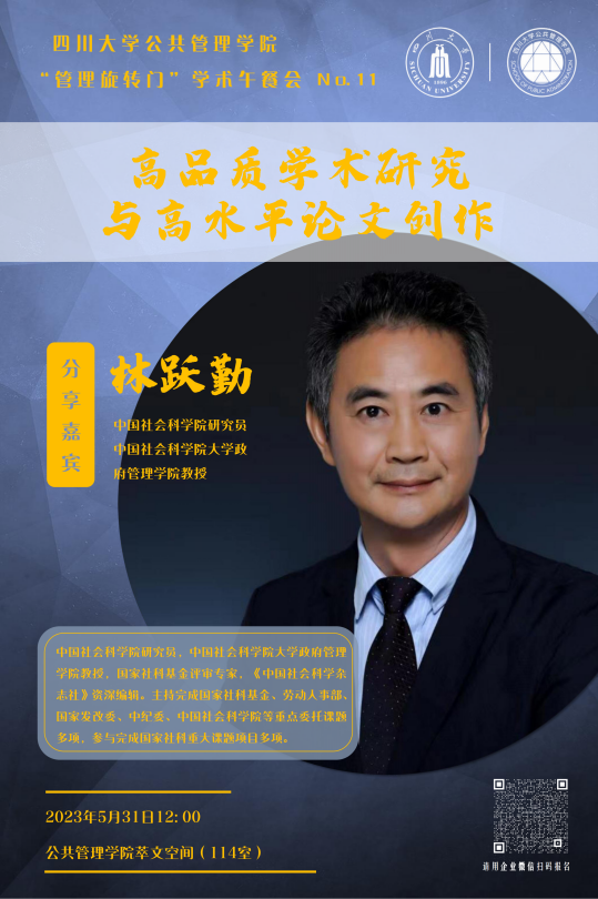 5月31日,PA视讯游戏官网在学院萃文空间成功开展第十一期“管理旋转门”学术沙龙活动。本期学术沙龙特邀中国社会科学院研究员、中国社会科学院大学政府管理学院教授林跃勤先生作题为“高品质学术研究与高水平论文创作”报告。学院领导班子成员、各学科老师、硕博士研究生约50人参加了本次活动。