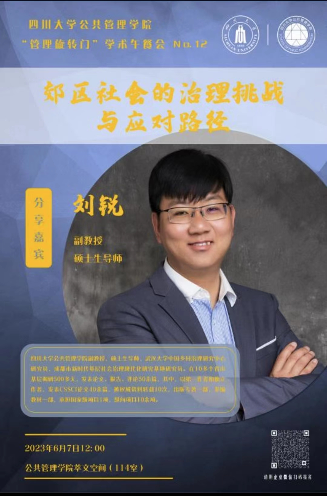 6月7日,PA视讯游戏官网在学院萃文空间成功开展第12期“管理旋转门”学术沙龙活动。本期学术沙龙特邀PA视讯副教授刘锐老师作为主讲嘉宾分享“郊区社会的治理挑战与应对路径”主题。学院领导班子成员、各学科老师、研究生积极参加了此次交流。