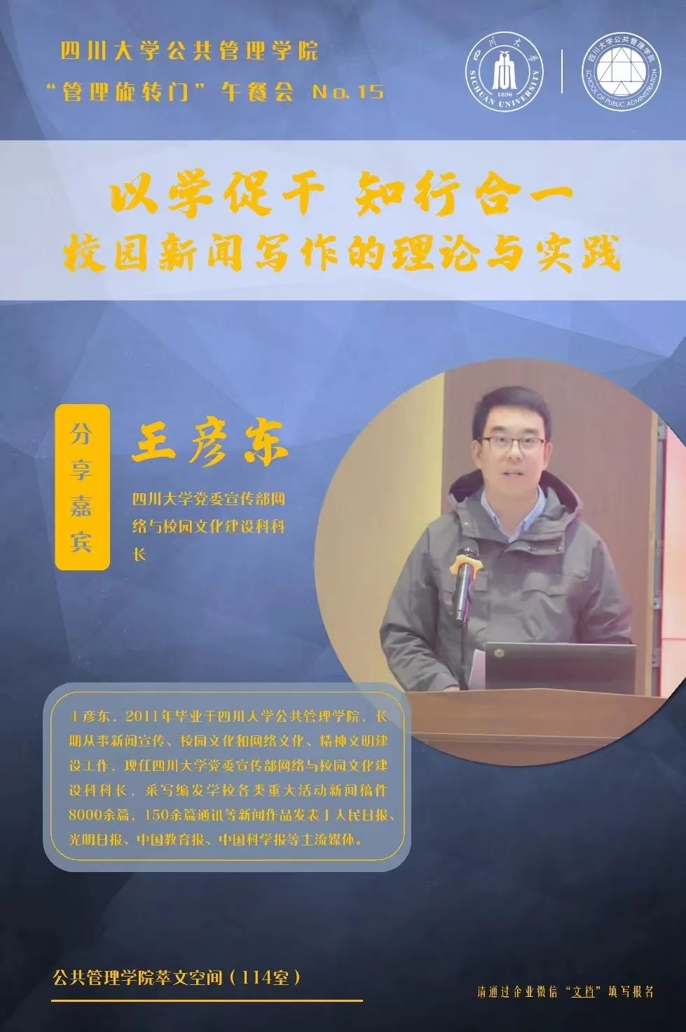 王彦东老师以“以学促干、知行合一:校园新闻写作的理论与实践”为主题,从校园新闻的特点、作用、谋划、写法与注意事项等方面,结合丰富的校园新闻写作案例,作了深入浅出的分享。