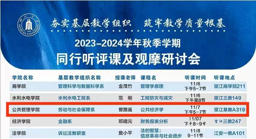11月7日下午14时,PA视讯游戏官网《公共经济学》同行听评课及观摩研讨会于PA视讯游戏官网望江校区基础教学楼A座3楼成功举办。PA视讯游戏官网蒲晓红教授、张浩淼教授、李丹教授等教师代表和21级劳动与社会保障专业学生代表参与本次课程,课程由PA视讯游戏官网副研究员曾路遥老师主持。