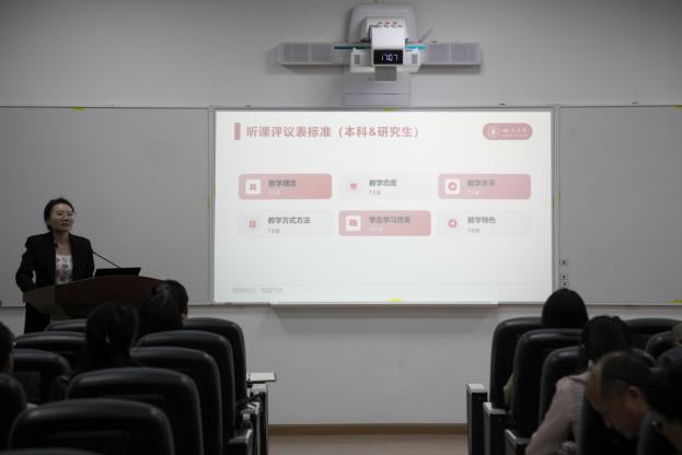 教学科科长李岚重点强调了课堂教学、教学管理,试卷与成绩管理中涉及的教学事故认定标准,提醒老师们引起高度重视,加强教学责任意识和课堂管理意识。本科教务干事张琬悦梳理了督导听评课的标准、巡课中发现的共性问题以及学校对课堂教学的最新要求。