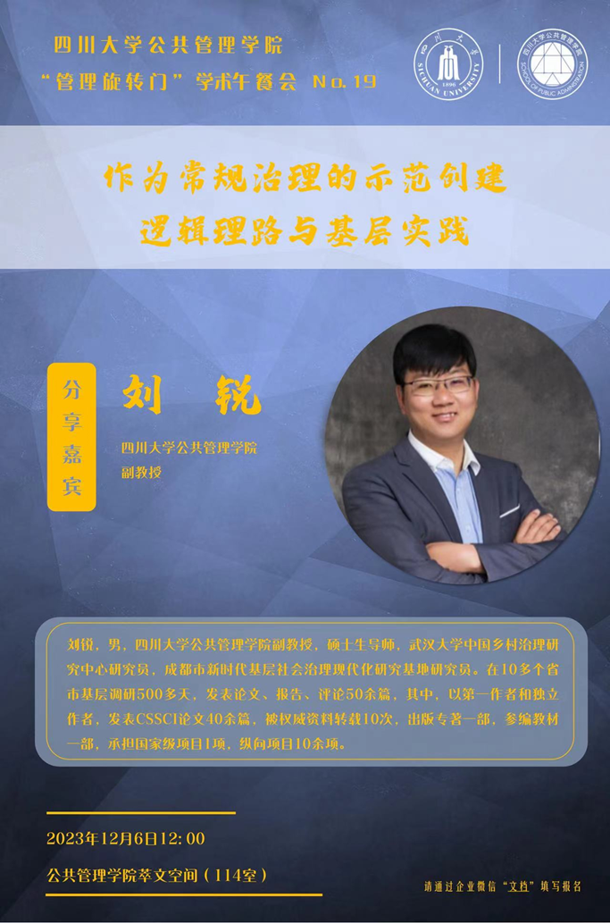近日,PA视讯游戏官网在学院萃文空间成功开展第十九期“管理旋转门”学术沙龙活动。本期学术沙龙特邀本学院刘锐副教授分享“作为常规治理的示范创建:逻辑理路与基层实践”,学院各学科老师、博士研究生积极参加了此次交流。本期学术沙龙由劳动与社会保障系田益豪副研究员担任学术主持。