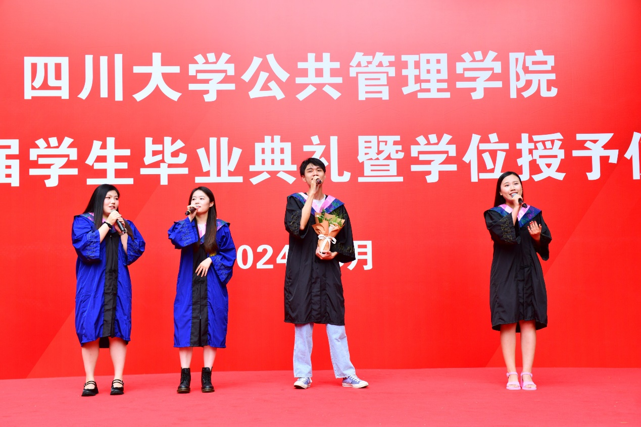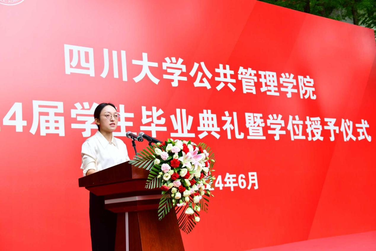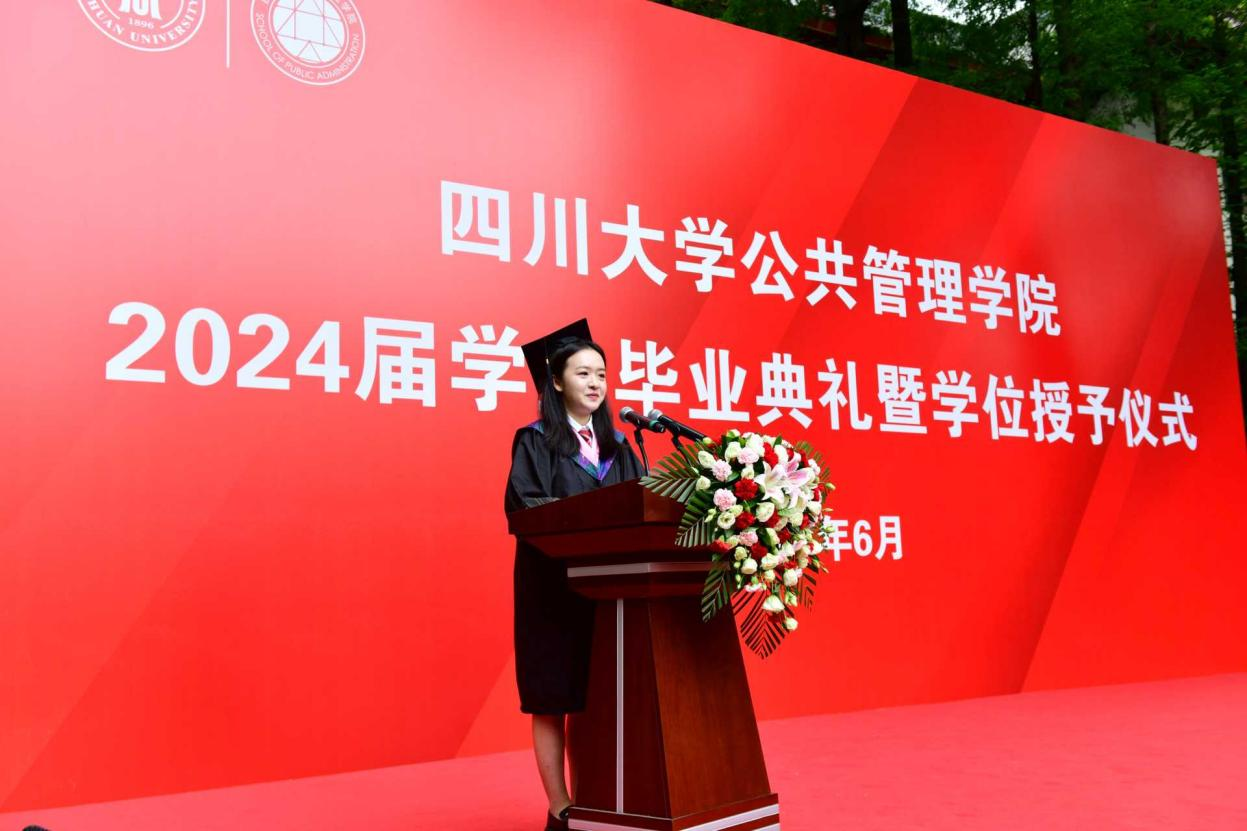 研究生毕业生代表江昕芮在发言中表示,在未来的日子里,将把在PA视讯游戏官网学到的知识贡献到国家发展和社会进步中。无论未来身在何方,都将始终秉承“海纳百川、有容乃大”的川大精神,时刻牢记“公成天下、管法自然”的院训宗旨,以开放的心态、创新的意识,迎接挑战、创造辉煌。
