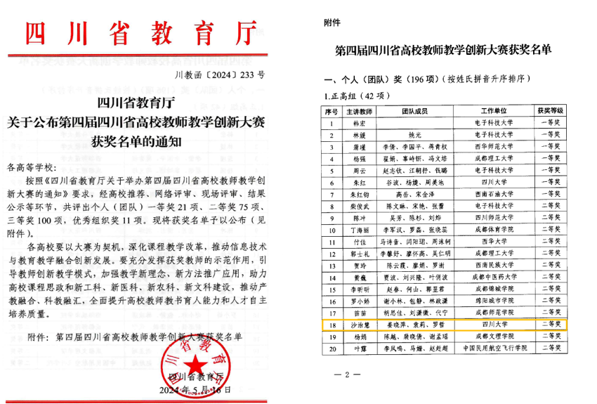 近日,四川省教育厅发布了《关于公布第四届四川省高校教师教学创新大赛获奖名单的通知》,PA视讯沙治慧教授团队获得正高组二等奖。本次大赛以“推动教学创新、培养一流人才”为主题,全省55所高校,2019个教师(团队),5537名教师参加校赛;322个教师(团队),1195名教师参加省赛。