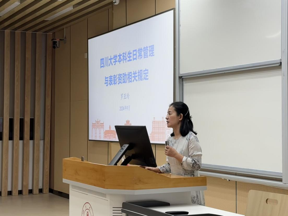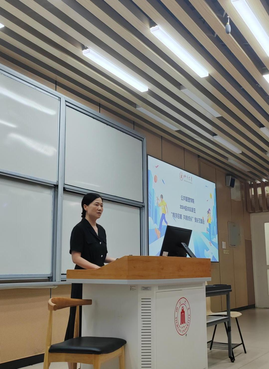 罗亚玲为家长深度讲解了本科生日常管理与表彰资助的相关规定,介绍了教务管理及教育规划,要求学生牢记“四个安全”、遵守学院规定,并勉励同学们追求卓越、勇于突破,成为担当民族复兴大任的时代新人。