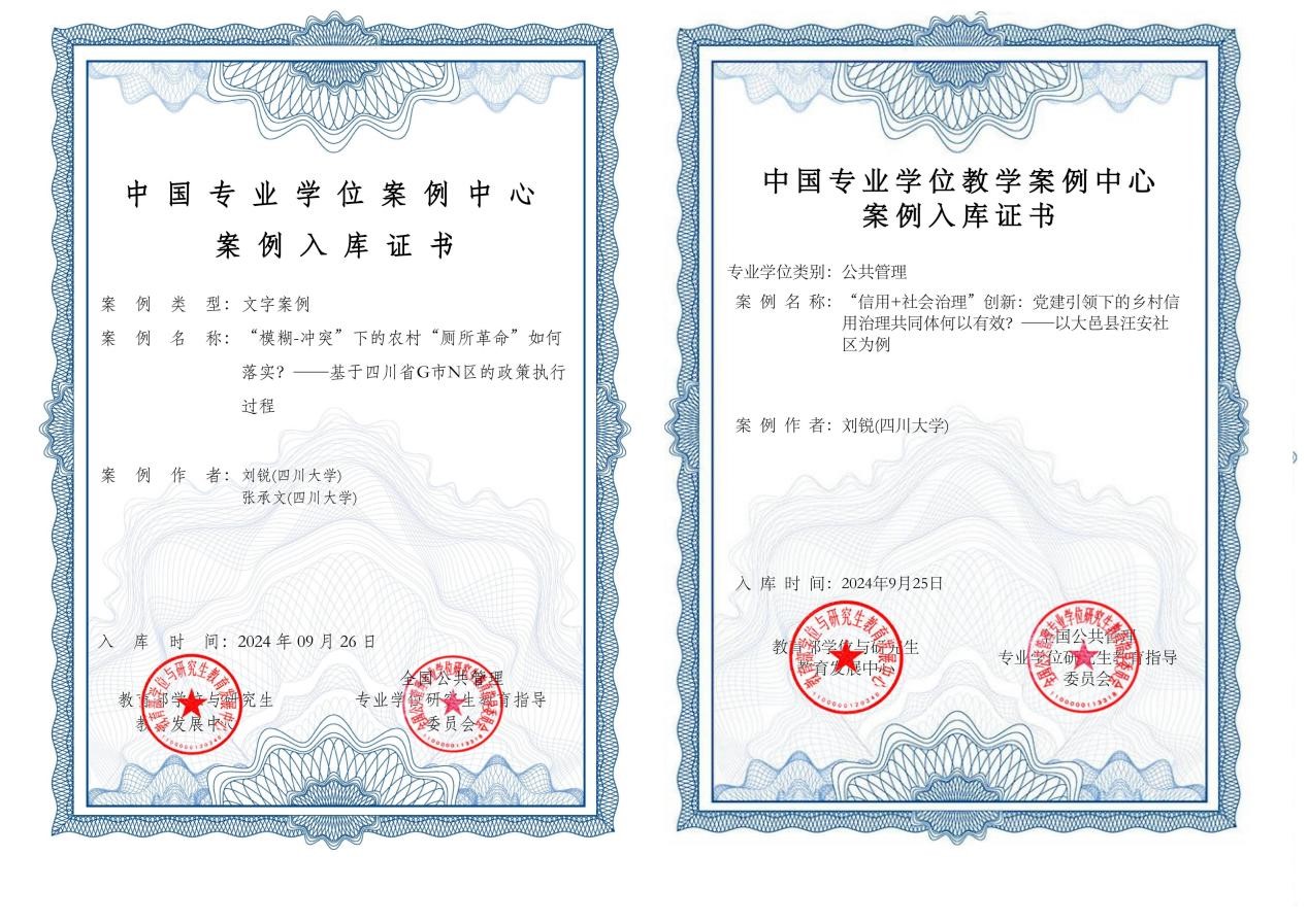 PA视讯刘锐老师的《“信用+社会治理”创新:党建引领下的乡村信用治理共同体何以有效?—以大邑县汪安社区为例》、《“模糊-冲突”下的农村“厕所革命”如何落实?—基于四川省G市N区的政策执行过程》两个案例成功入库。