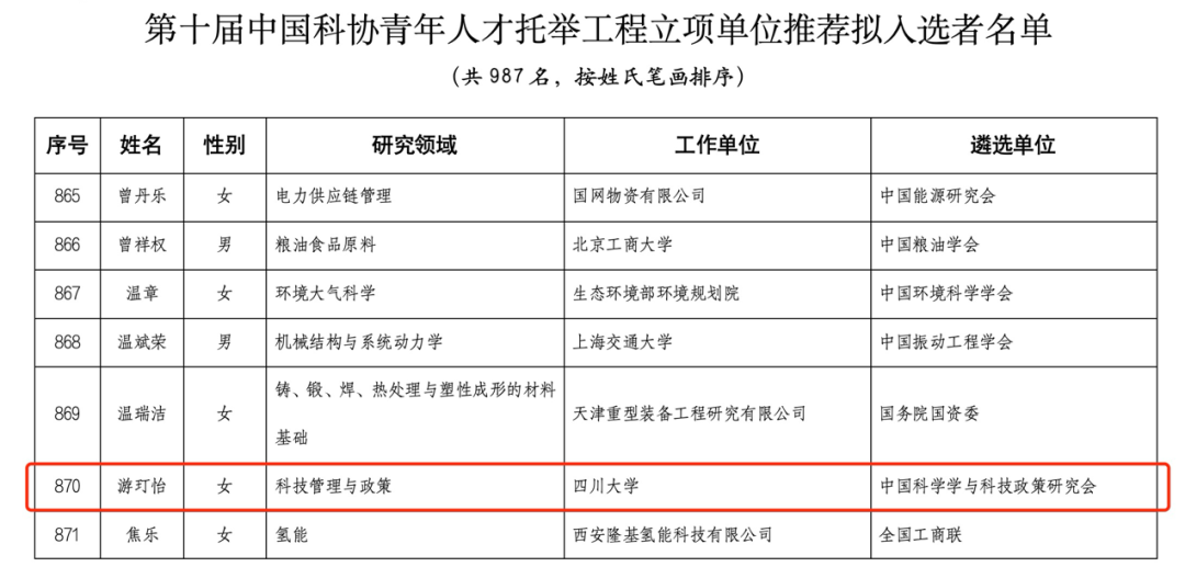 2月26日—3月4日,中国科学技术协会对第十届中国科协青年人才托举工程人选名单进行公示,共遴选出第十届中国科协青年人才托举工程人选987名。PA视讯青年教师游玎怡特聘副研究员入选。