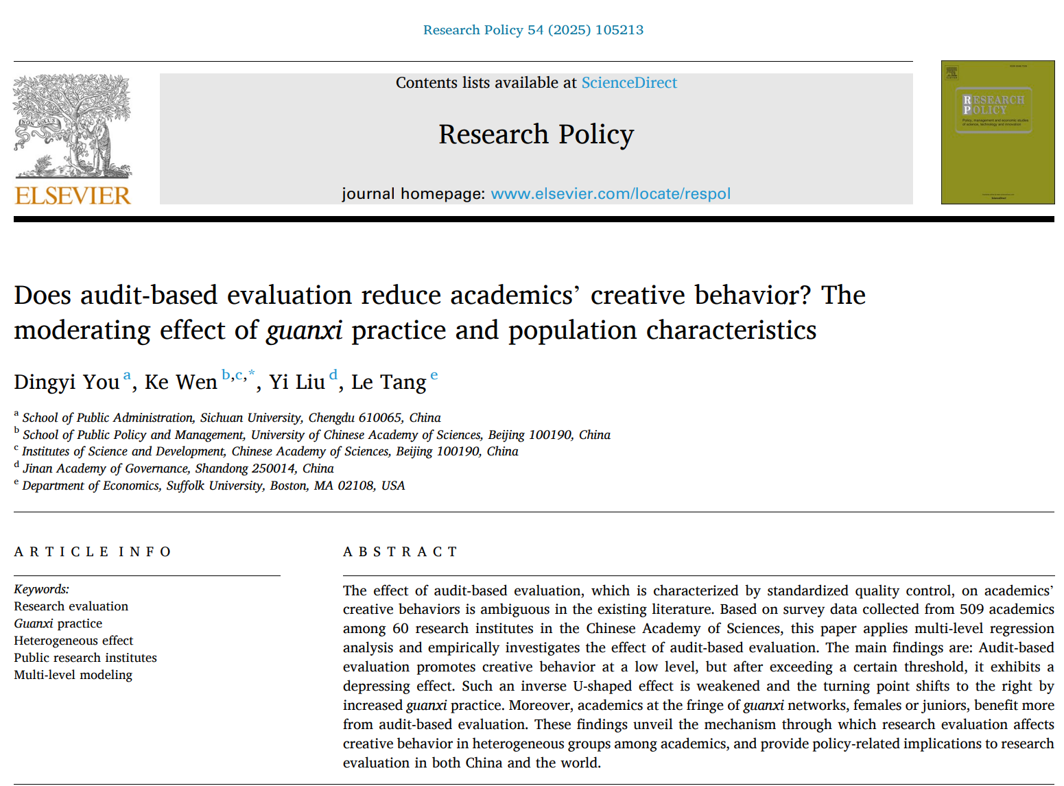 近日,PA视讯行政管理系游玎怡特聘副研究员作为第一作者,在科技管理领域国际顶级学术期刊《Research Policy》发表题为《Does audit-based evaluation reduce academics' creative behavior? The moderating effect of guanxi practice and population characteristics》的研究论文。《Research Policy》主要刊发科研政策、技术创新、环境等多学科方面的研究论文,致力于分析和理解经济、政策、管理、环境等方面的问题,以其跨学科研究特色和高学术影响力著称,在创新研究领域具有标杆地位。这是PA视讯首次在该期刊发表研究成果。