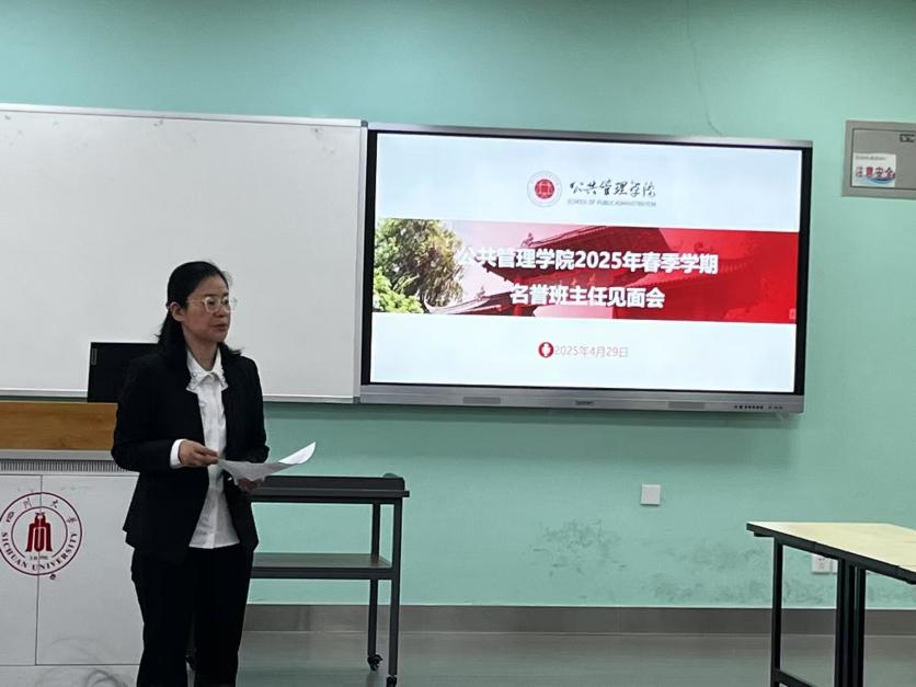 4月29日下午,为深入推进学风建设,学院党委副书记罗亚玲教授在江安校区一教D104开展名誉班主任见面会,同行政管理、社会保障班学生亲切交流。会议由2023级本科生辅导员袁玲主持。