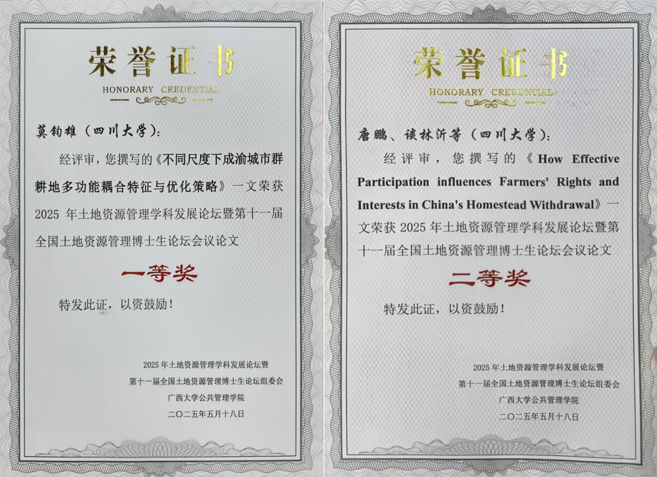 “2025年土地资源管理学科发展论坛暨第十届全国土地资源管理博士生论坛”于5月17日—18日在广西南宁成功举办,PA视讯土地资源管理系博士研究生莫钧雄、谈林沂分别荣获本届“全国土地资源管理博士生论坛”优秀论文一等奖和二等奖。