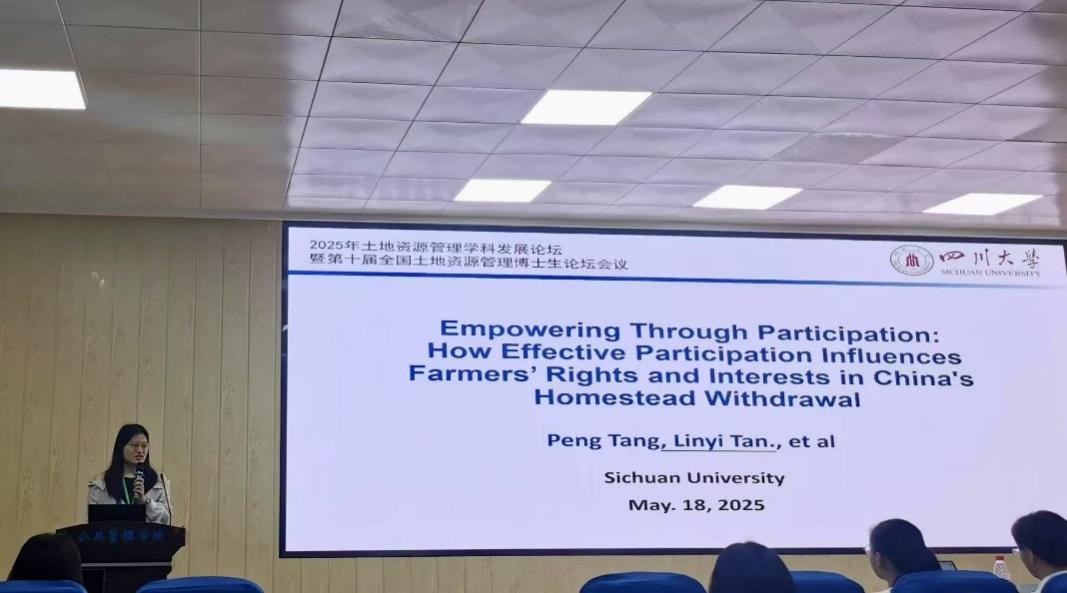 谈林沂同学(指导老师:唐鹏老师)在分会场一“复杂人地关系的探讨”,以《How effective participation influences farmer’s rights and interests in China’s homestead withdrawal》为题目开展了学术汇报,论文基于农民有效参与的概念框架,利用四川省部分试点地区的微观调查数据,系统地评估了农民有效参与和权益保护的水平。