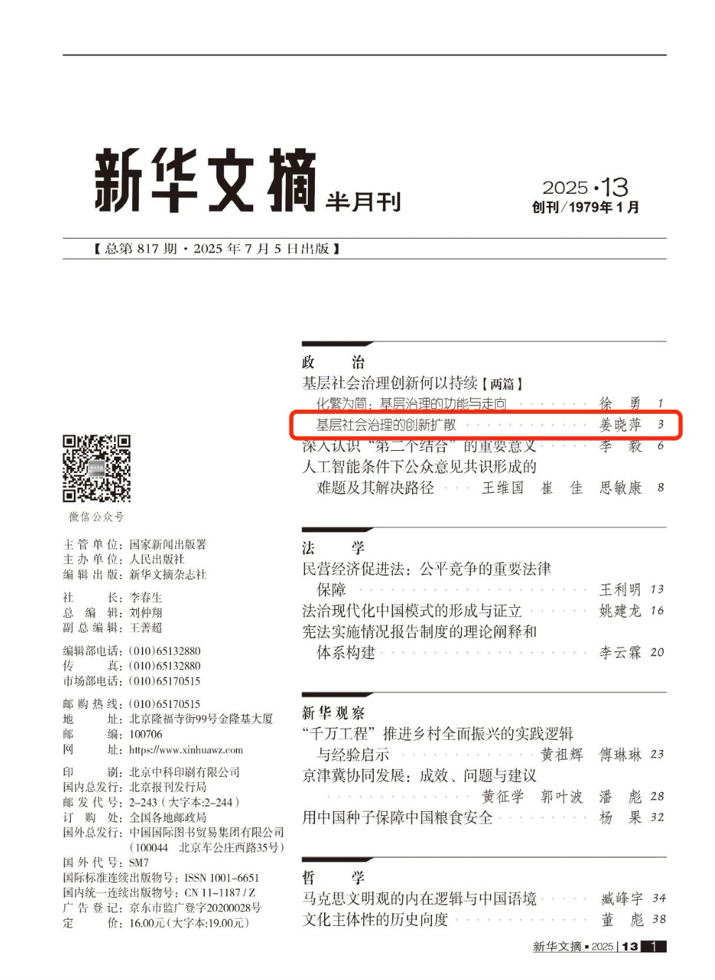 7月出版的《新华文摘》(2025年第13期)转载了PA视讯姜晓萍教授的论文《基层社会治理的创新扩散》。