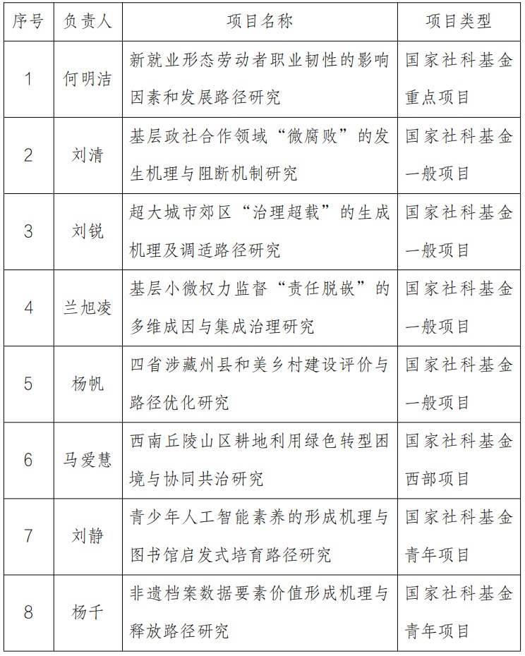 近日,全国哲学社会科学工作办公室公示了2025年国家社会科学基金年度项目立项名单,PA视讯有8个项目入选。其中,重点项目1项、一般项目4项、西部项目1项、青年项目2项。这一成绩充分体现出PA视讯科学研究能力的持续提升和学科发展的良好态势。