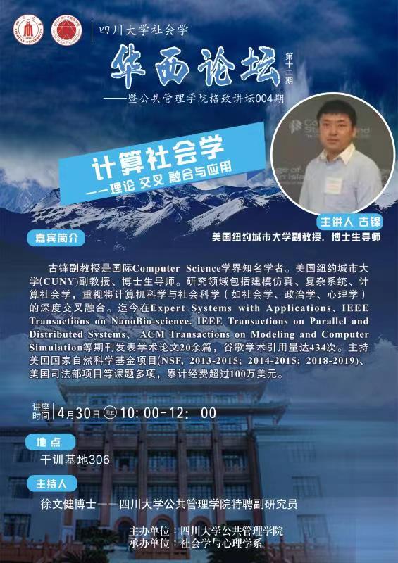 古锋副教授是国际Computer Science学界知名学者,美国纽约城市大学(CUNY)副教授。研究领域包括建模仿真、复杂系统、计算社会学,重视将计算机科学与社会科学(如社会学、政治学、心理学)的深度交叉融合。迄今在Expert Systems with Applications、IEEE Transactions on NanoBioscience、IEEE Transactions on Parallel and Distributed Systems、ACM Transactions on Modeling and Computer Simulation等期刊发表学术论文20余篇,谷歌学术引用量达434次。主持美国国家自然科学基金项目(NSF, 2013-2015;2014-2015;2018-2019)、美国司法部项目等课题多项,累计经费超过100万美元。
